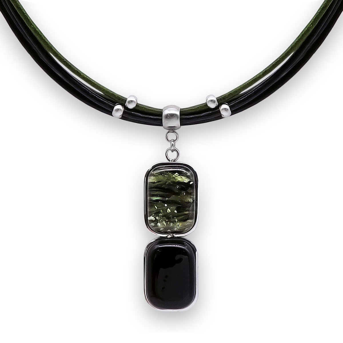 Колье изготовлено из натуральной кожи, муранского стекла и гипоаллергенной ювелирной стали, что очень важно для людей с чувствительной кожей. Металл не темнеет и не подвергается воздействиям окружающей среды, надолго обеспечивая красивый внешний вид изделия. Длина колье - 46 см + 5 см. удлиняющая цепочка. Размер стеклянных элементов - 2х1,5 см. Вес - 20 гр.