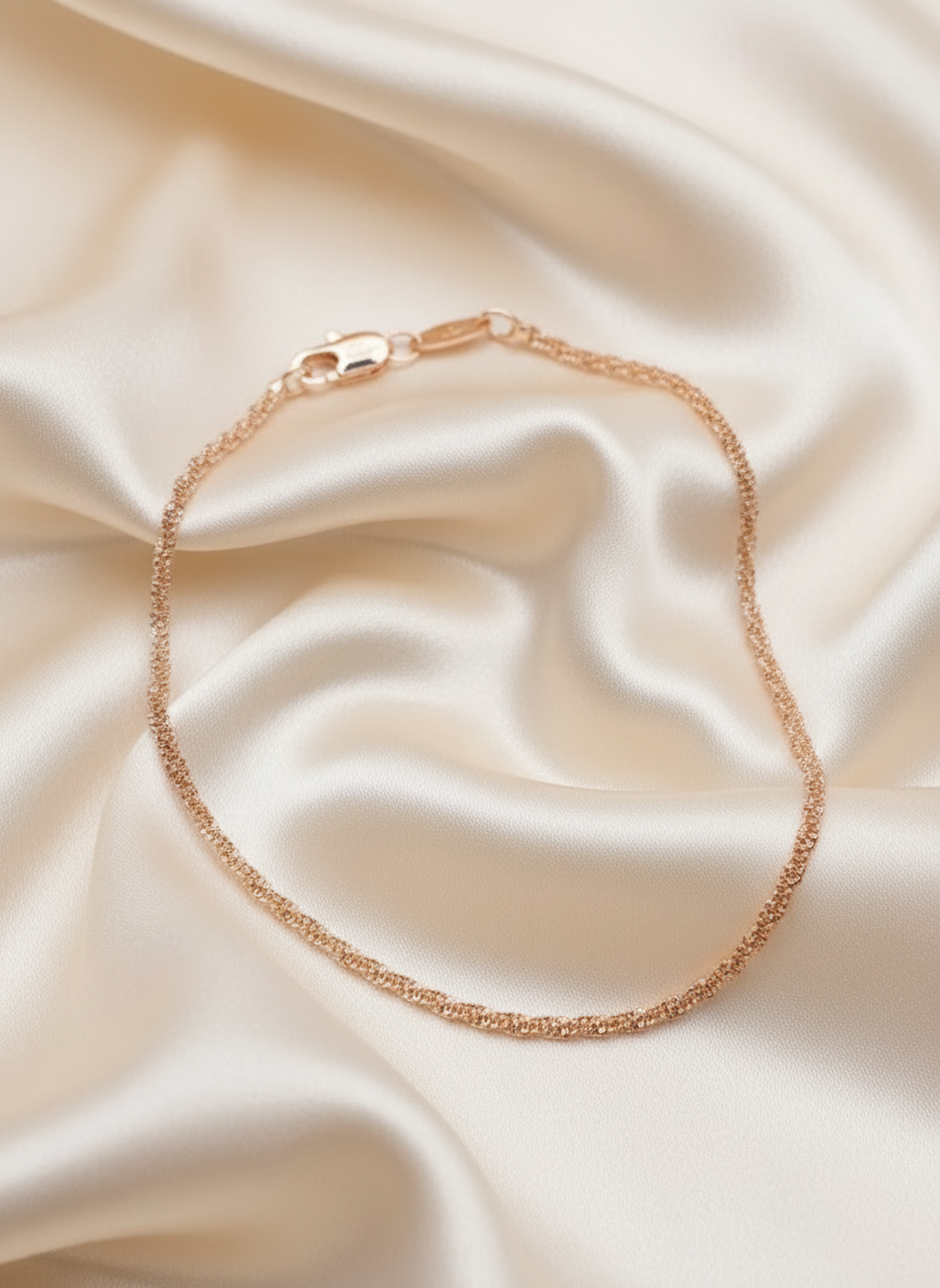 Этот браслет словно соткан из множества золотистых нитей. Утончённое изящество и непередаваемый шарм украшения делают его стильным акцентом на руке своей обладательницы. Невероятно нежное, но вместе с тем прочное плетение "Сингапур", в сочетании с надёжным креплением, позволяют такому браслету быть незаменимым в повседневном использовании.