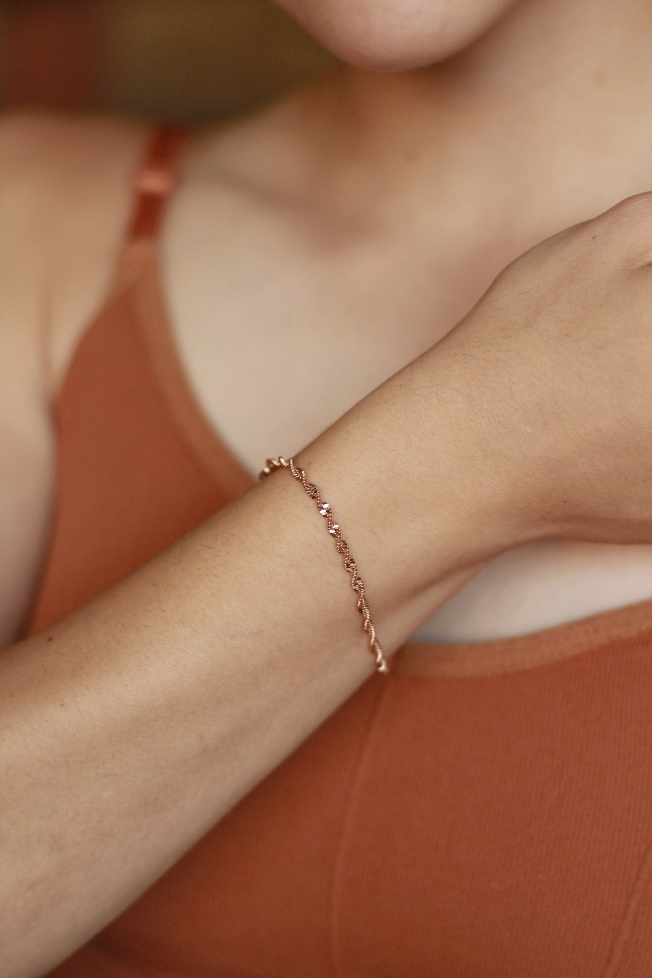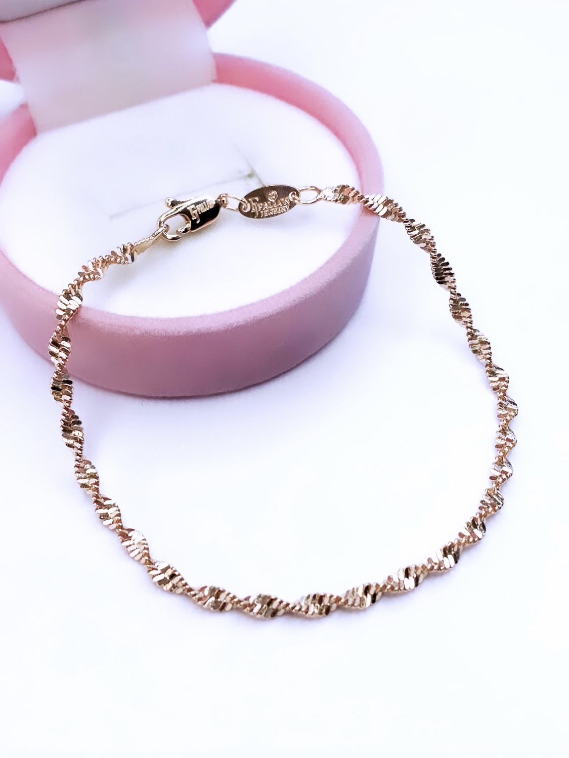 Игривый браслет, изготовленный с помощью разновидности техники панцирного плетения "Сингапур", обладает рядом несомненных преимуществ. За счёт кокетливого завитка, аксессуар способен искриться и блестеть от самого небольшого движения руки, универсальный облик подойдёт практически к любому типу одежды, а повышенная прочность подарит обладательнице свободу движений. Прекрасный аксессуар станет одним из любимых в вашей коллекции.