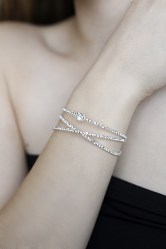 Удивительно нежный и изысканный браслет словно соткан из россыпи прозрачных цирконов. Сдержанное мерцание камней привлекает внимание к запястью свой обладательницы и оттеняет даже самый строгий деловой образ. Акцент из более крупного минерала позволяет композиции аксессуара выглядеть выразительно и завершённо.