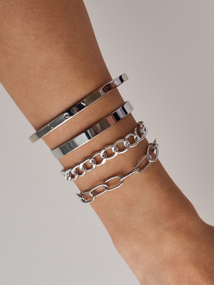 Лаконичный дизайн четырёх браслетов прекрасно сочетается между собой, придавая обладательнице неуловимую нотку уверенности в себе и своей индивидуальности. Трендовые плетения выглядят стильно и сдержанно, подчёркивая отличный вкус своей владелицы. Браслеты будут актуально выглядеть как вместе, так и по отдельности.
