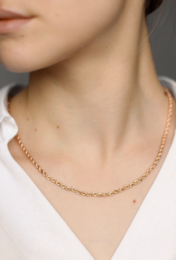 Цепь, созданная с помощью плетения "Верёвка", отличается высокой прочностью и объёмным внешним видом. Такое изделие прекрасно подходит для массивных кулонов или подвесок, однако отлично выглядит и в качестве самостоятельного украшения. Харизматичный внешний вид цепи подойдёт для создания яркого акцента как в мужском, так и в женском образе.