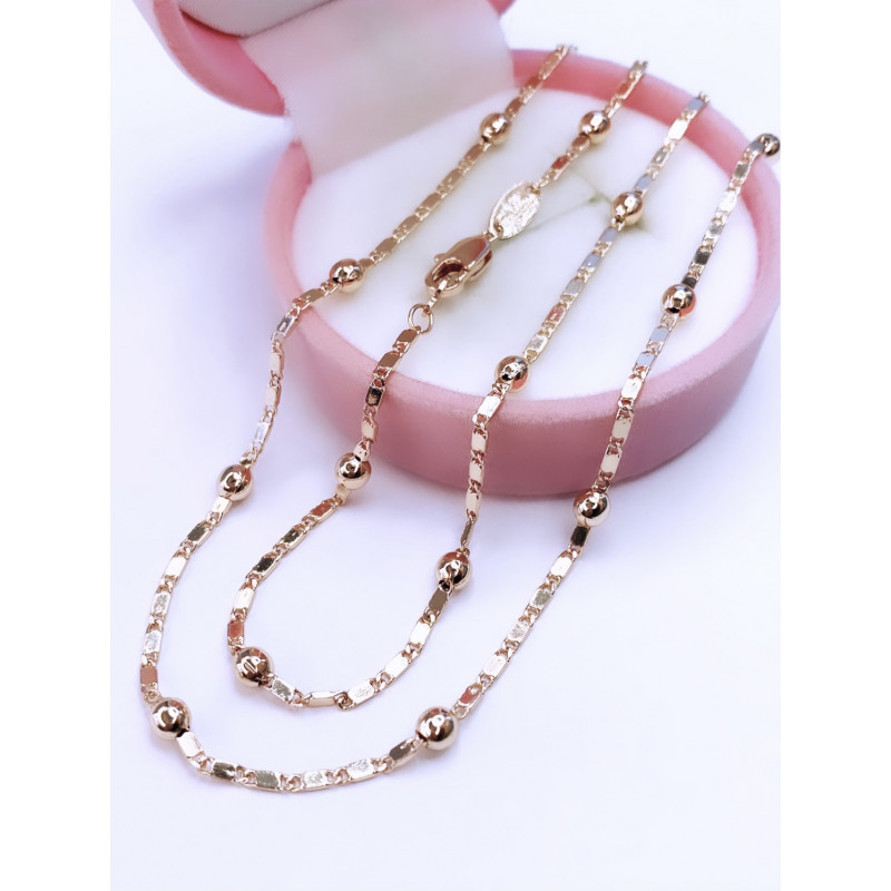 Лаконичный облик этой цепи оценят любительницы стильных и сдержанных украшений. Строгое плетение звеньев перемежается с небольшими вкраплениями из золотистого металла в форме шариков. Такая цепь самодостаточна и может выступать самостоятельным украшением, подчёркивая деловой стиль и прекрасный вкус своей обладательницы.