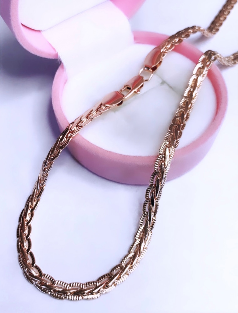 Оригинальная и яркая цепь, напоминающая форму косы, непременно понравится любительницам стильных и эффектных украшений. Такое изделие сможет стать центральной нотой делового или вечернего образа. А искусное исполнение и надёжная техника плетения сделает эту цепь долговечной и комфортной в использовании.