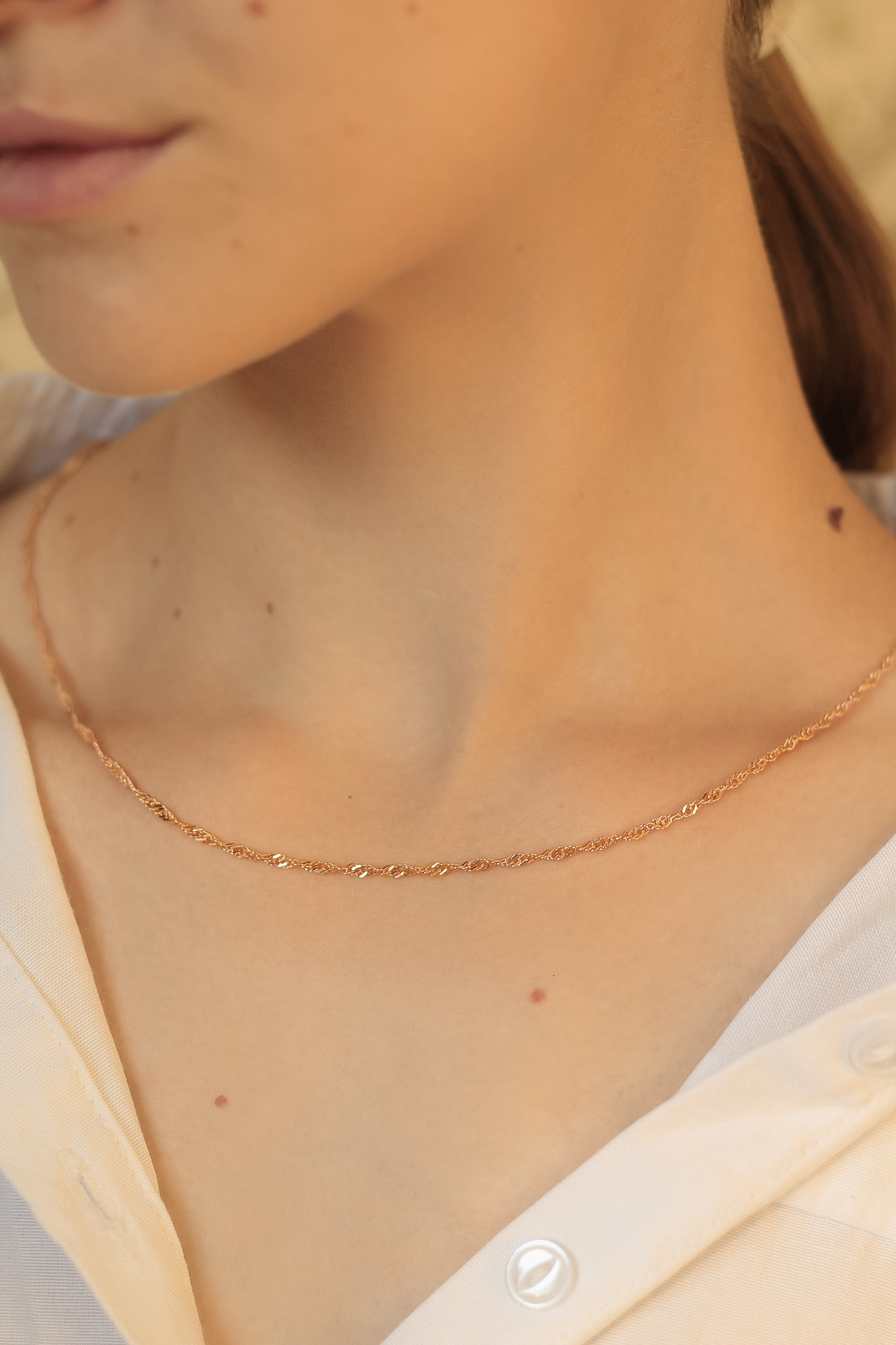 Что может быть изящнее, чем тонкая цепь с нежным игривым завитком, которая украшает свою обладательницу. Изящество изделия прекрасно сочетается с надёжной разновидностью панцирного плетением "Сингапур". С таким украшением вы будете чувствовать себя свободно и уверенно, а окружающие непременно отметят ваш прекрасный вкус при выборе аксессуаров.