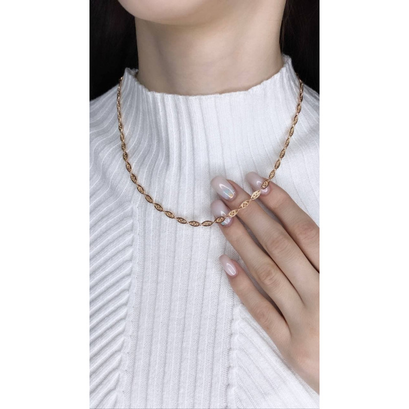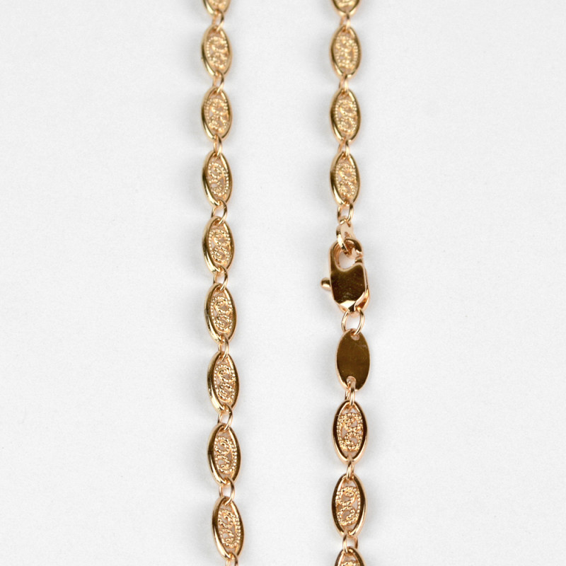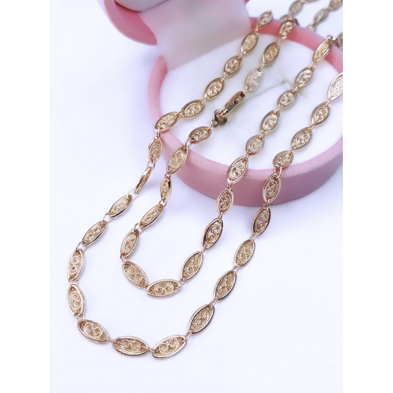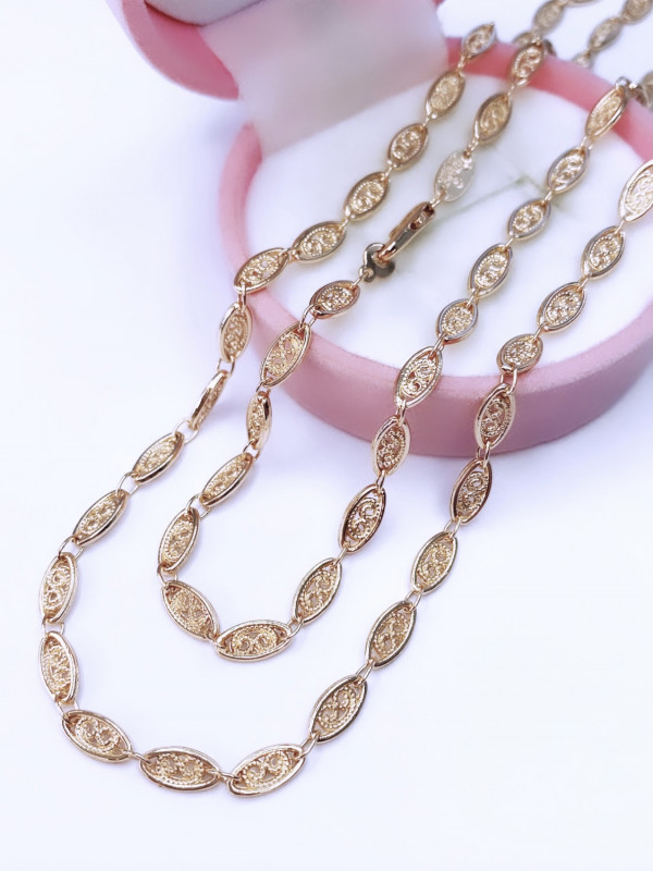 Эту оригинальную и нежную цепь хочется рассматривать снова и снова. Каждое звено украшения выполнено словно произведение искусства, и имеет свой завершённый рисунок. Кружевное переплетение витиеватых линий, заключённое в овал звена, складывает собой прекрасное украшение, которое непременно станет изюминкой вашего образа.