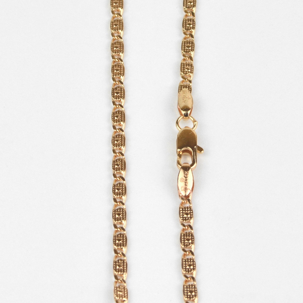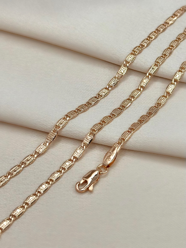 Необычный и притягательный облик этой цепи достигается за счёт сочетания ярких звеньев, имеющих свой завершённый рисунок.Узор из металла золотистого оттенка переливается и искрится от самого небольшого лучика света, создавая ореол загадочности вокруг своей обладательницы. Такая цепь выглядит нарядно и может выступать в качестве самостоятельного украшения, не требующего дополнения кулонами или подвесками.