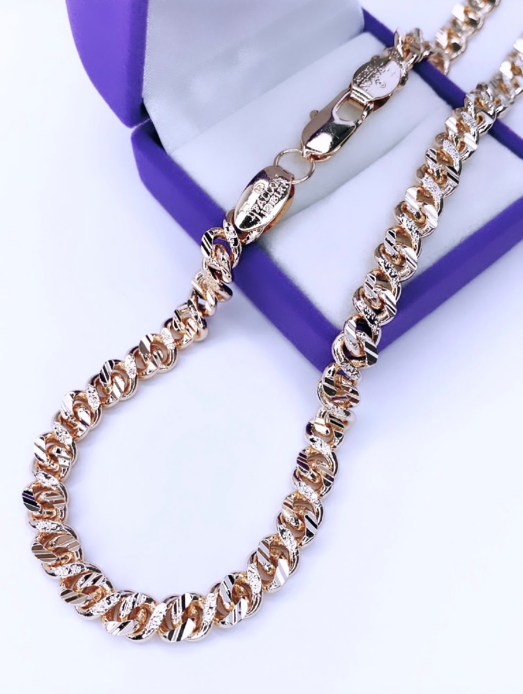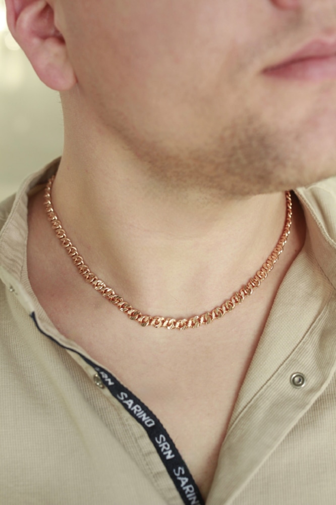 Объёмная, эффектная цепь, изготовленная в технике ажурного плетения "Восьмёрка", актуальна для свободолюбивого, яркого представителя сильного пола. Эффектный вид аксессуара обращает на себя внимание и позволяет подчеркнуть индивидуальный стиль своего обладателя. Такая цепь выигрышно смотрится со множеством деловых и свободных образов.