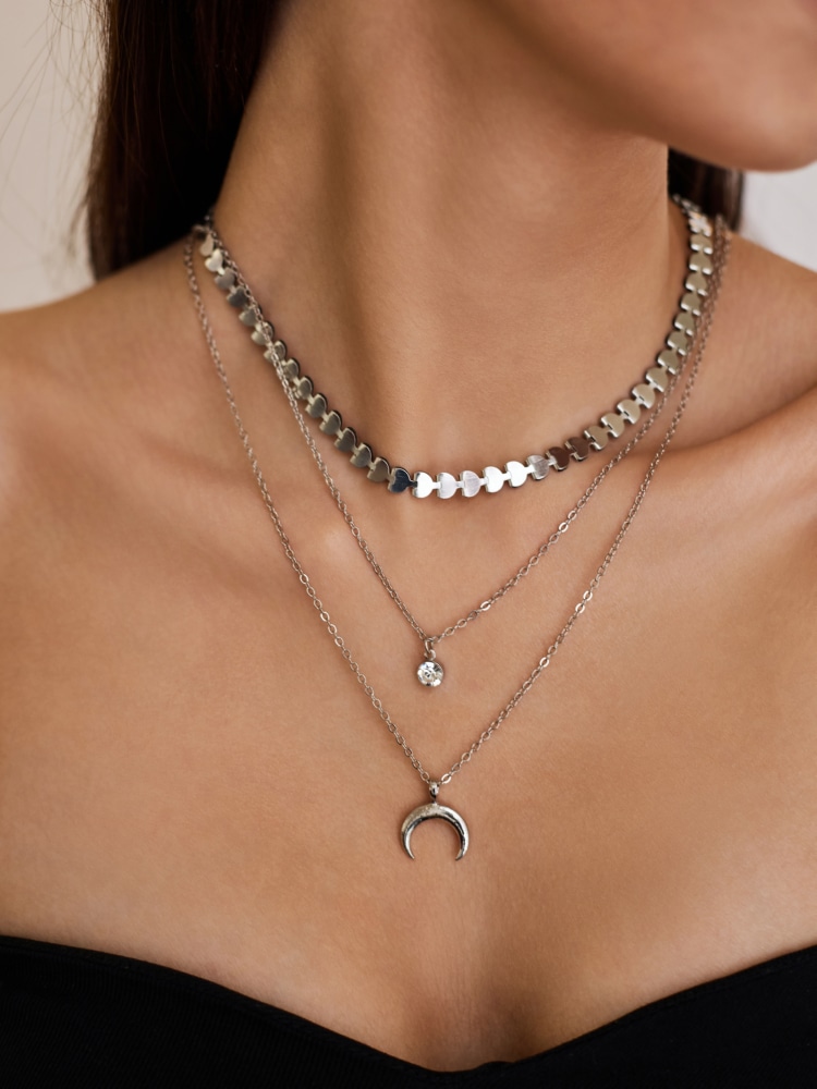 Продуманное сочетание трёх цепочек с разными акцентами создаёт лёгкий и изысканный образ. Плетение, напоминающее форму сердечек, прекрасно оттеняется искристыми прозрачными минералами на тонких серебристых нитях, и выглядит завершённым и удивительно нежным. Такая цепь станет одной из любимых в вашем ювелирном гардеробе.