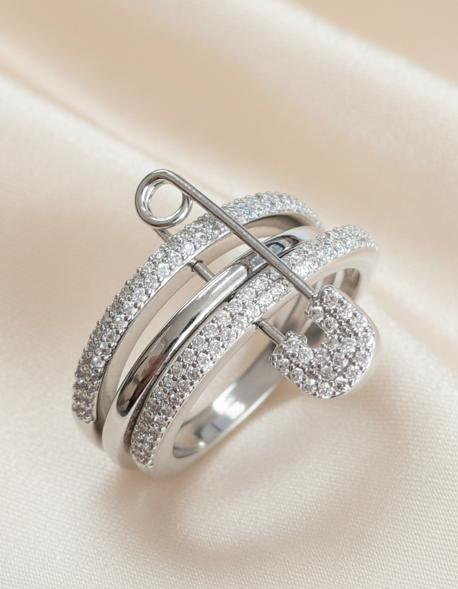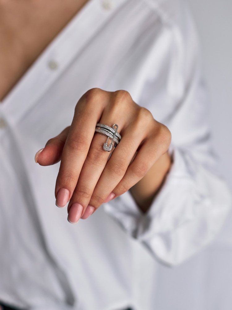 Необычное кольцо оценят любительницы оригинальных украшений, которые призваны подчеркнуть их индивидуальный характер. Россыпь крошечных блестящих минералов, декоративная булавка и строгий серебристый блеск металла станут отличным акцентом множества образов. Ищите выразительный и немного дерзкий аксессуар? Это кольцо создано специально для вас.