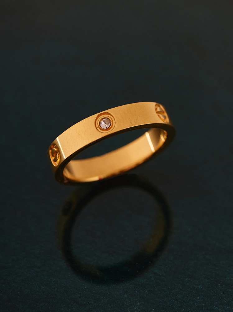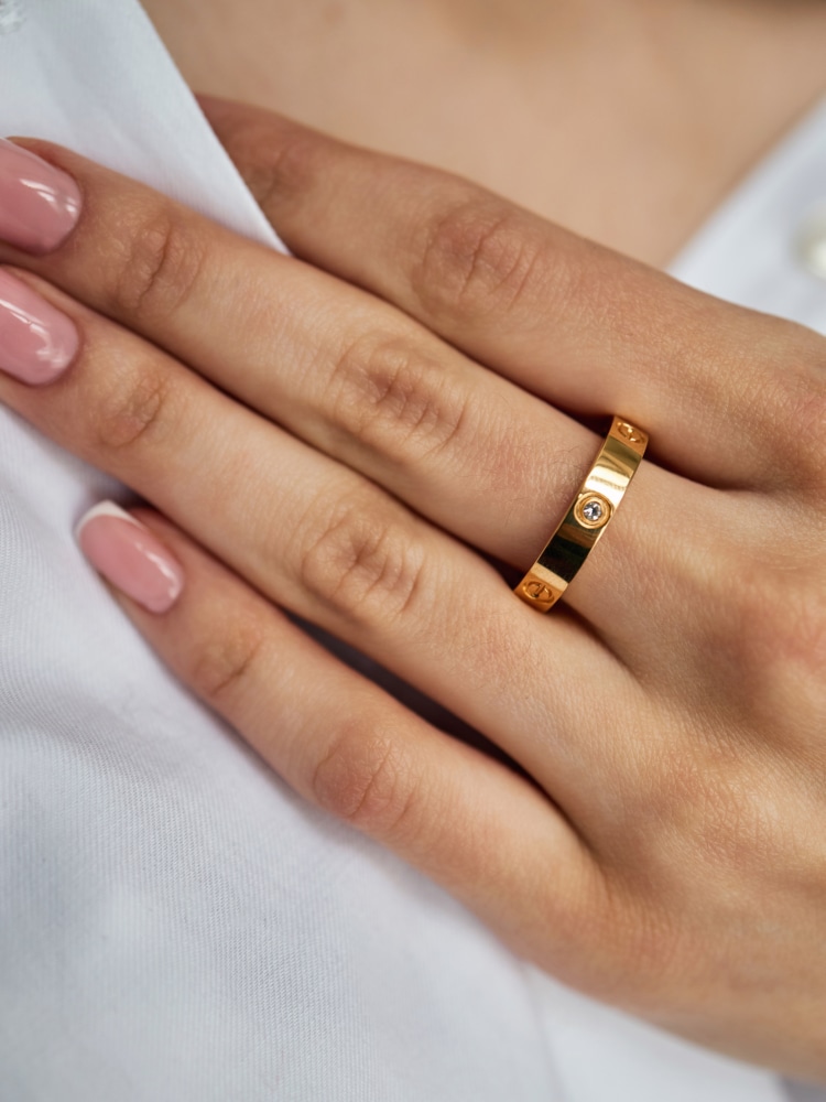 Оригинальное исполнение кольца понравится стильным девушкам, отслеживающим последние новинки ювелирной моды. Сочетание прозрачного минерала среднего размера, лаконичного орнамента и золотистого строгого блеска металла делает аксессуар прекрасным дополнением множества образов. Такое кольцо непременно должно быть в ювелирном гардеробе настоящей модницы.