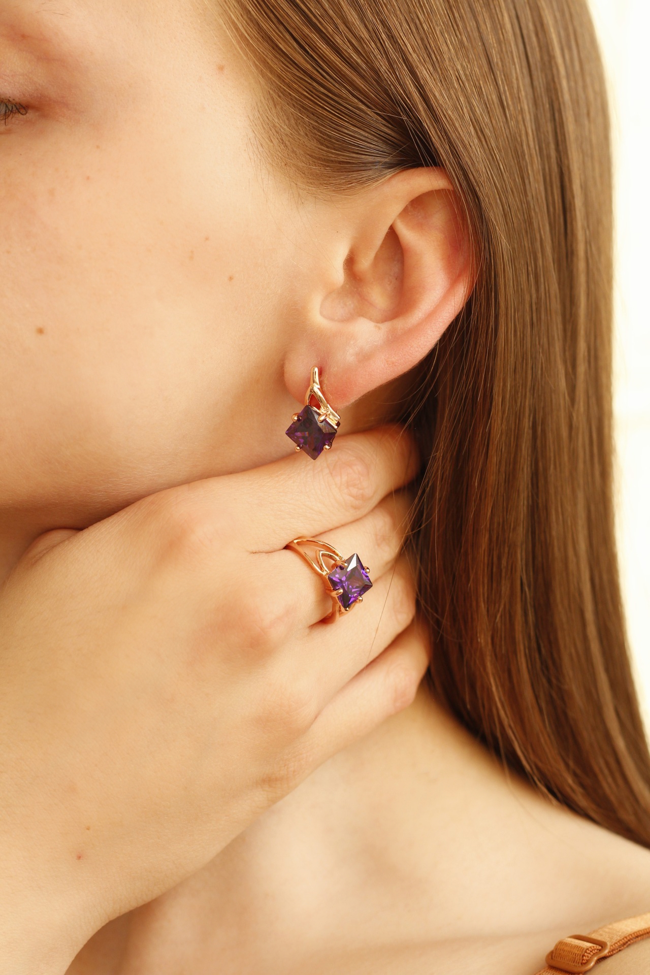 В дизайне этого украшение все указывает на его эксклюзивность. В основе комплекта крупные камни, имитирующие аметисты. Глубокий фиолетовый цвет напоминает о бальных платьях из бархата, а оправа под золото – о рамах старинных зеркал. Такой аксессуар способен вдохновлять, за это его по достоинству оценят творческие натуры.