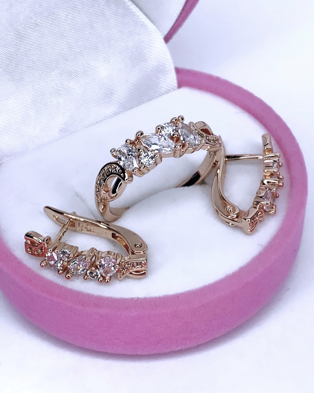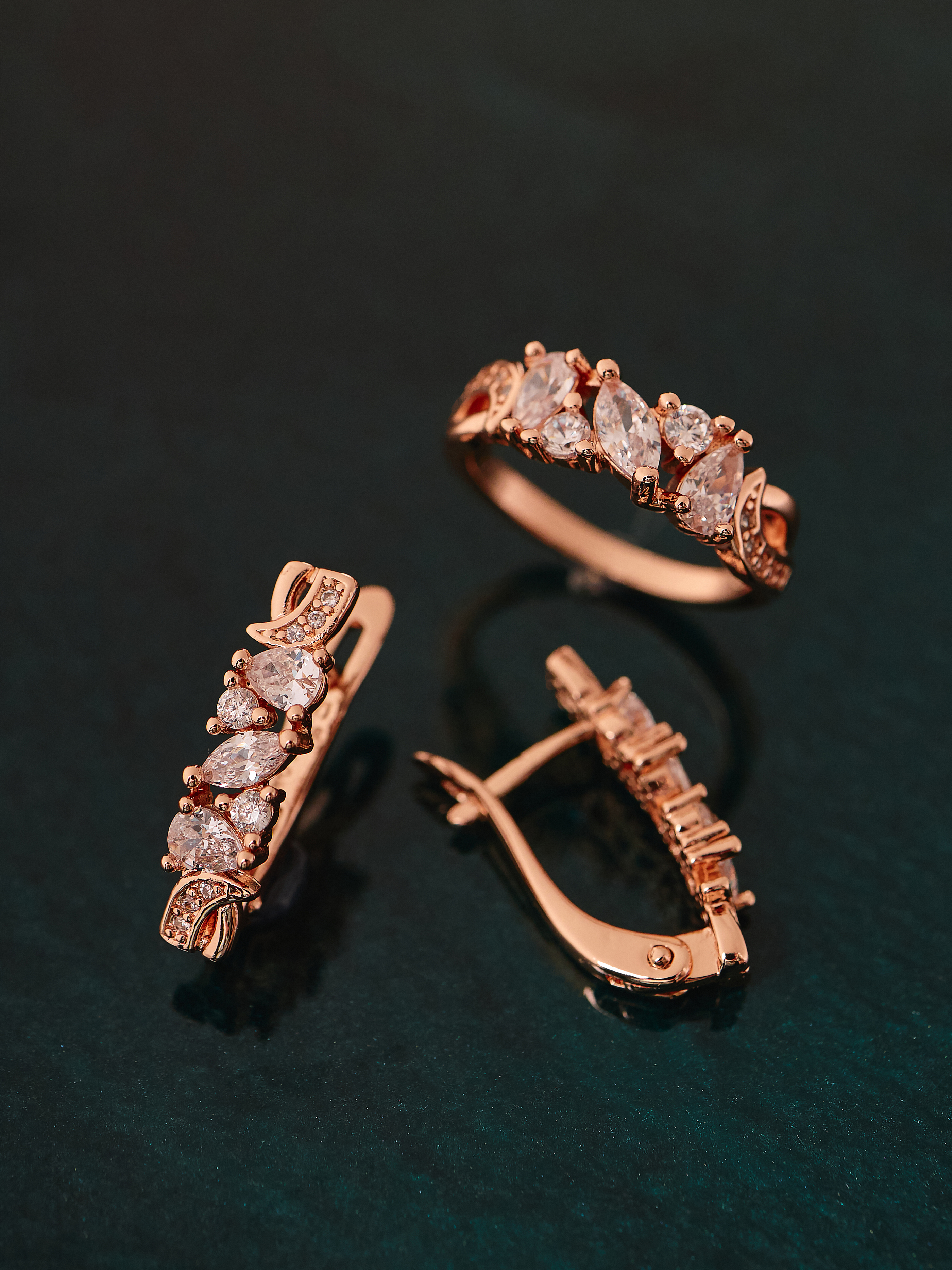 Затейливый дизайн комплекта притягивает к своей обладательницы множество восторженных взглядов. Оригинальная форма изделий, искусно дополненная прозрачными цирконами разных размеров, может создавать как яркий акцент повседневного образа, так и гармоничное дополнение вечернего платья. Невероятно притягательный и нежный, такой комплект обязательно станет одним из любимых в вашей коллекции.