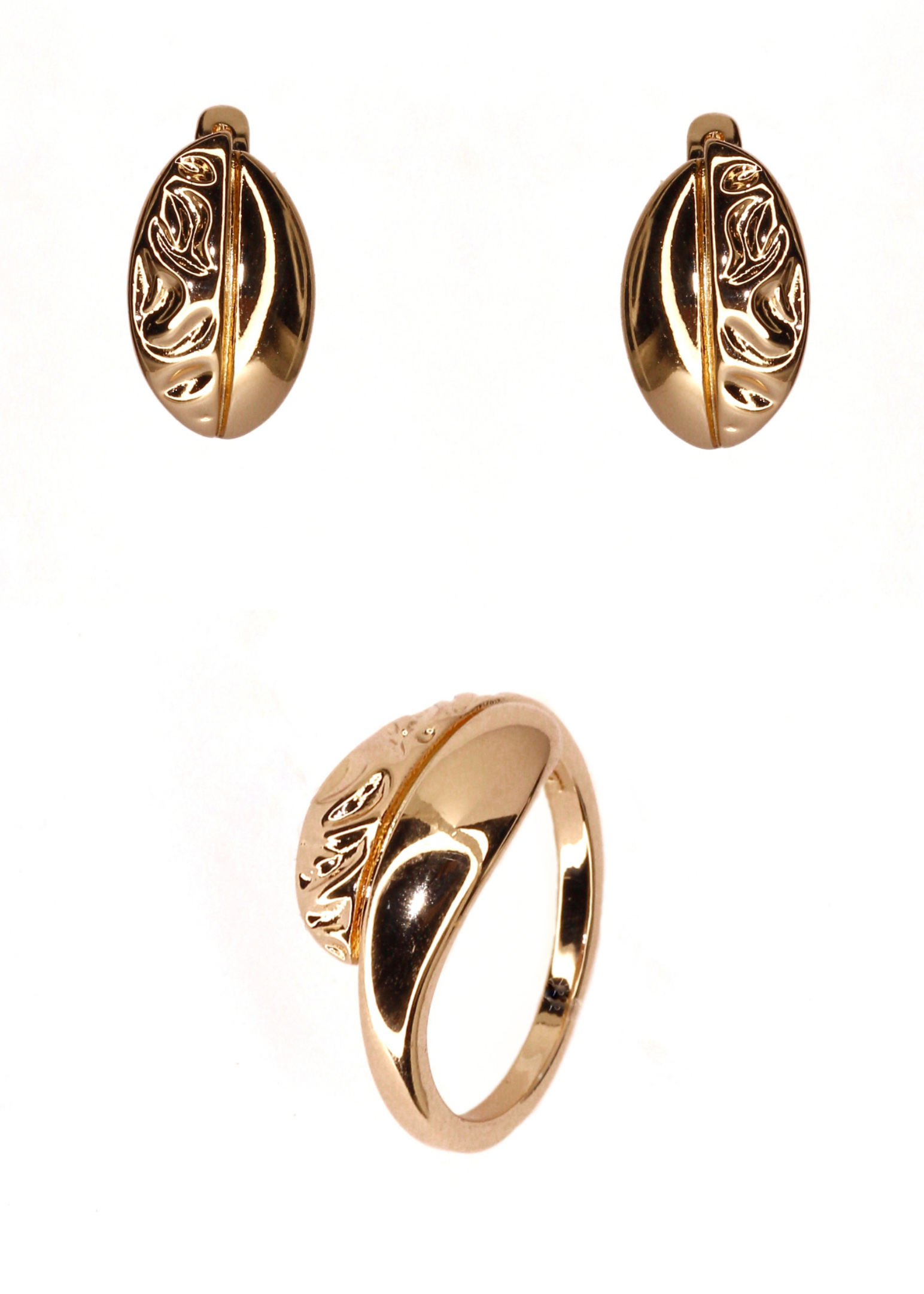 Лаконичное исполнение серёг и кольца, входящих в этот комплект, имеет свою изюминку. Словно разделённые на две половины, изделия отличаются идеально гладкой поверхностью и кружевом золотистого металла. Две энергии, соединённые дизайнерами воедино, будут дополнять образ, и добавлять своей обладательнице уверенности и неповторимого шарма.
