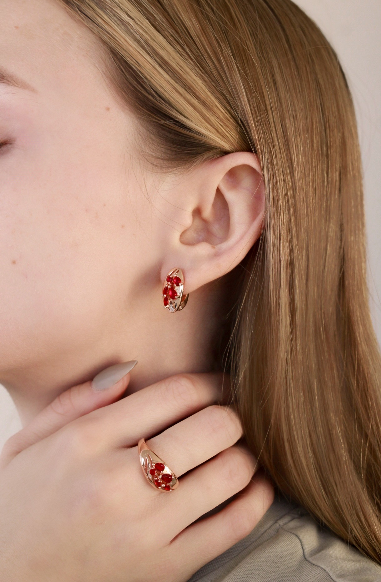 Манящая россыпь минералов рубинового цвета, выступает основой кольца и серёг, входящих в этот великолепный комплект. Яркий и манящий, такой тандем оценят любительницы харизматичный и эффектных украшений. Аксессуары буду безупречно выглядеть с белой офисной рубашкой, или дополнять вечерний образ своей обладательницы.