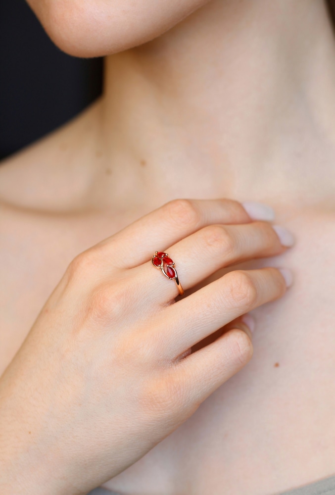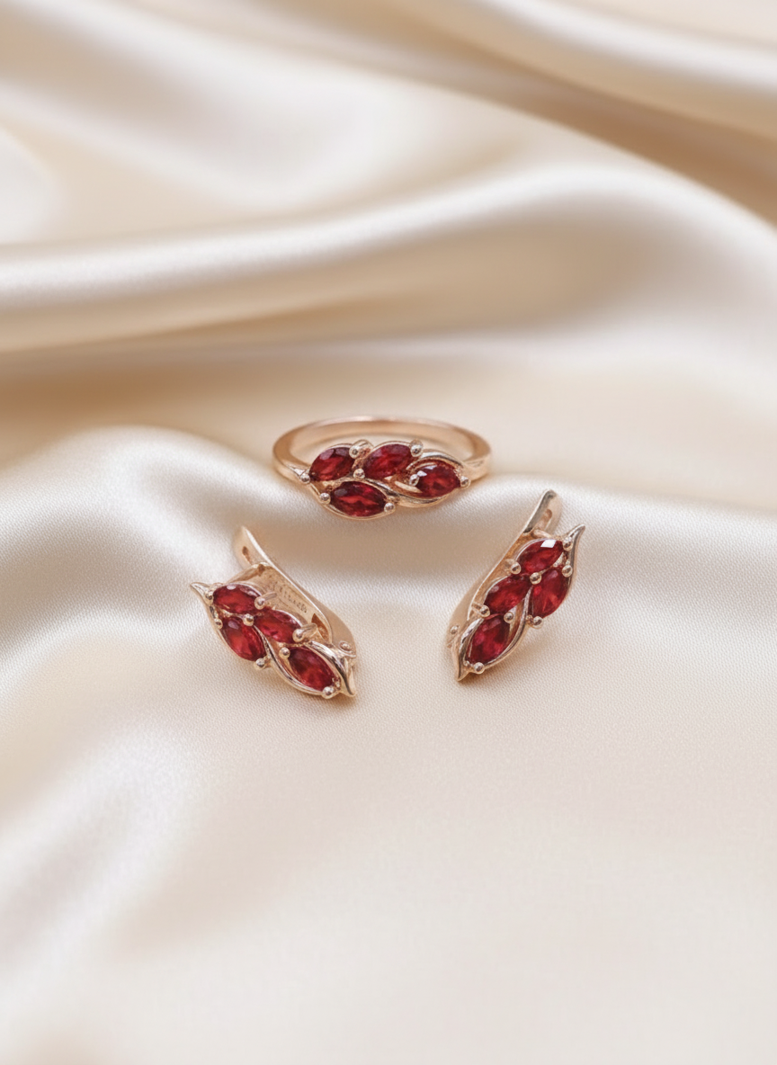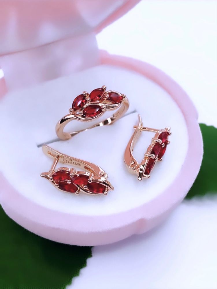 Парные украшения всегда выглядят гармонично и вдвойне подчёркивают стильный образ своей обладательницы. Тандем из серёг и кольца, дополненных яркими алыми цирконами, станет несомненным акцентом для дневного или вечернего выхода. Эффектный вид и харизматичная элегантность изделий непременно добавят вам уверенности в своей неотразимости.