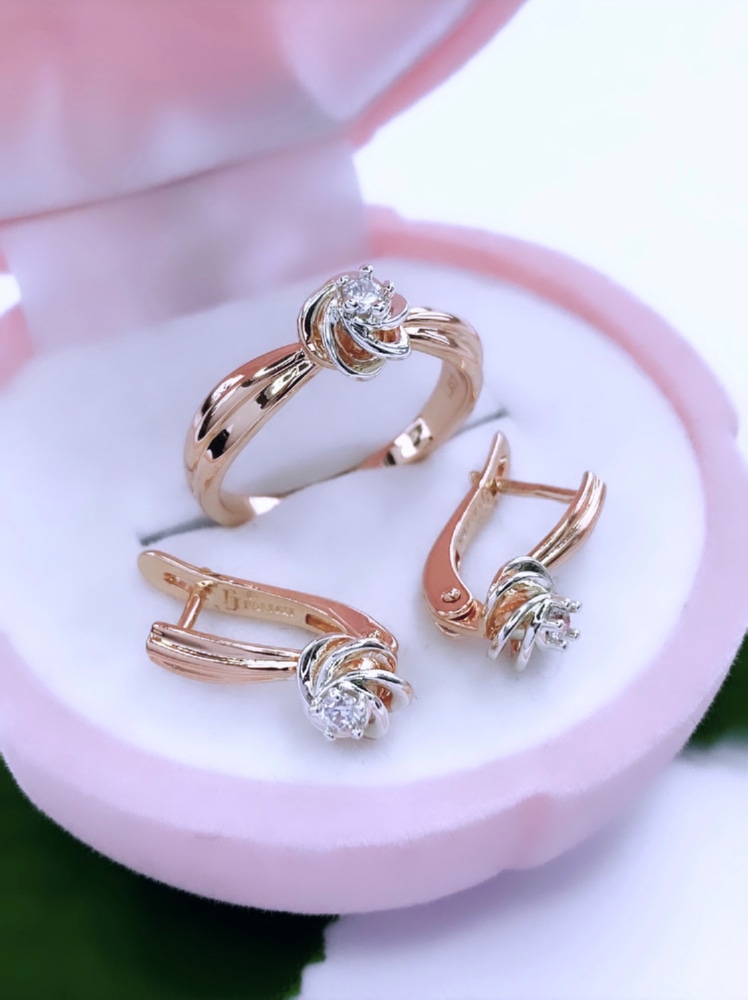 Комплект из серёг и кольца, центральным акцентом которых выступает прозрачный циркон, подойдёт ко множеству образов. Нежные и вместе с тем запоминающиеся изделия, прекрасно дополняют друг друга, или выступают как отдельные аксессуары. Тёплое мерцание минералов подчёркивает изящество рук и красоту лица своей обладательницы. Этот комплект станет великолепным подарком, за который вам будут точно благодарны.