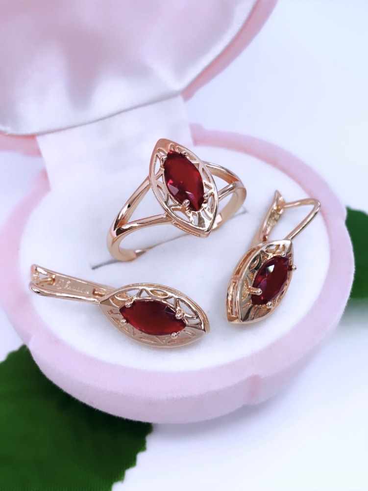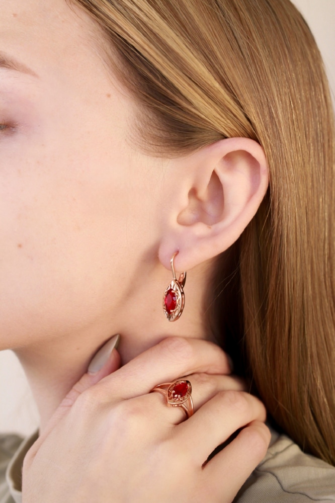 Рубиновый цвет в ювелирных аксессуарах - неизменная классика, которую выбирают яркие и уверенные в себе представительницы прекрасного пола. Роскошный комплект из кольца и серёг, с насыщенными алыми камнями, отлично оттенит деловой офисный костюм, или станет основой вечернего страстного образа. Этот комплект не раз выручит свою обладательницу, выделившись из большого числа украшений.