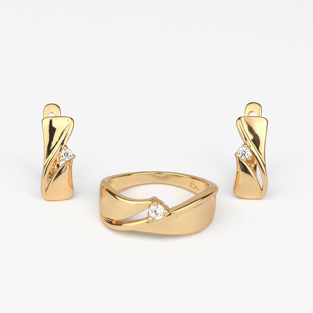 Стильный дизайн комплекта не перегружен лишними деталями. Сочетание оригинальной формы со вставкой из небольшого циркона, выглядит лаконично и сдержанно. Игривый блеск прозрачного минерала добавляет изделиям изюминку, а их обладательнице уверенности в себе и неповторимого шарма. Этот комплект станет прекрасным дополнением как для делового, так и для свободного образа.