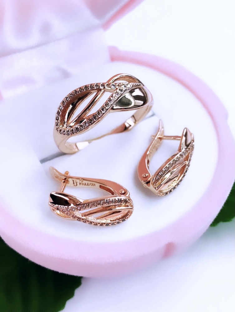 Элегантный комплект, представляющий собой витиеватое плетение плавных сдержанный линий золотистого металла, инкрустированных нежно мерцающими цирконами, выглядит невероятно женственно и притягательно. Такие серьги и кольцо смогут подчеркнуть статусность и прекрасный вкус своей обладательницы, а их нежный облик станет гармоничным завершением продуманного образа.