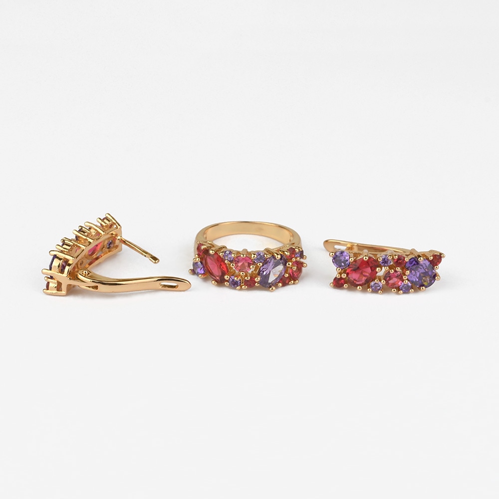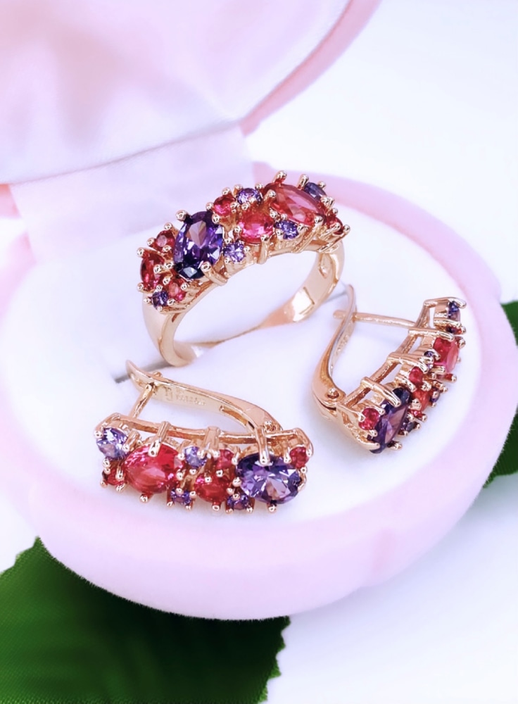 Выразительный комплект, состоящий из серёг и кольца, непременно выделится на фоне множества других украшений. Микс камней, формирующих аксессуары, одновременно яркий и нежный. Дизайнерам изделий удалось подобрать великолепное сочетание цветов, которые не смогут оставить равнодушной ни одну ювелирную модницу. Такой комплект способен стать основой многих стильных образов.