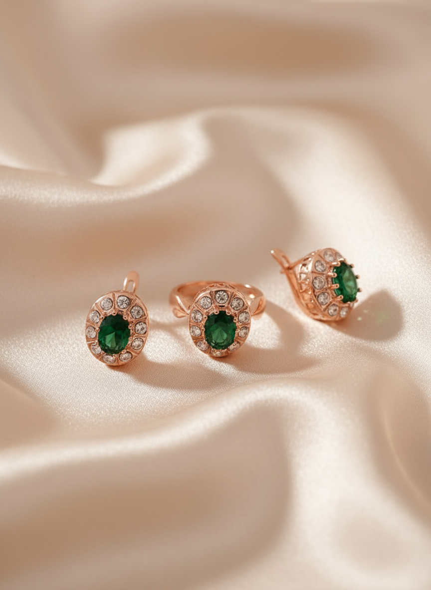 Минералы изумрудного цвета, используемые в ювелирных украшениях, притягивают к своей обладательнице удачу и дарят спокойствие. Изумительный комплект, основой которого выступают зелёные камни, дополненные небольшими сверкающими цирконами, придаст своей владелице шарм и непередаваемое обаяние. Притягательный облик аксессуаров оттенит даже самый строгий деловой костюм, или станет гармоничным дополнением вечернего образа.
