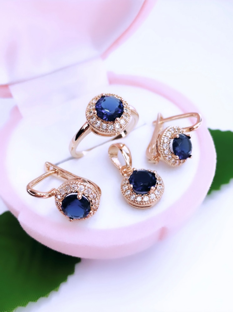 Яркие синие минералы, украшающие комплект из серёг, кулона и кольца - что может быть прекраснее и притягательнее? Классическая форма изделий и невероятные переливы крошечных и крупных минералов, создают идеальный ювелирный тандем, способный выделяться на фоне множества украшений. Хотите затмить всех на праздничном вечере своей индивидуальностью и роскошным обликом? Такой комплект вам непременно в этом поможет.