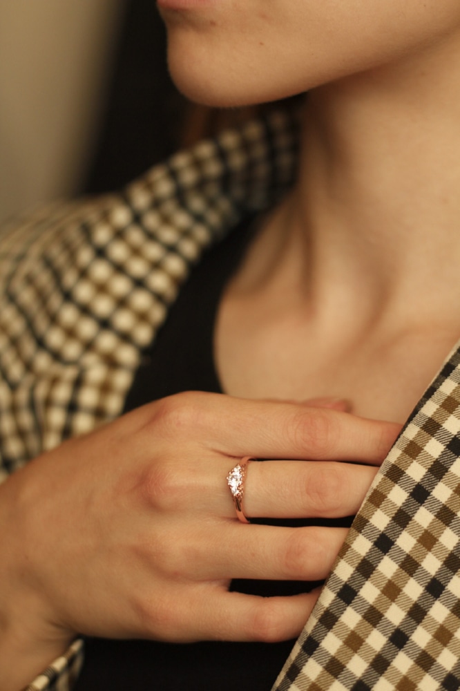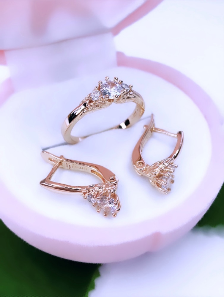 Классический комплект, состоящий из серёг и кольца, отличается стильным и сдержанным исполнением. Лаконичные линии изделий и нежное мерцание прозрачных цирконов подчёркивают прекрасный вкус своей обладательницы. Такой комплект способен разнообразить практически любой дневной образ, а также подчеркнуть изысканное вечернее платье.