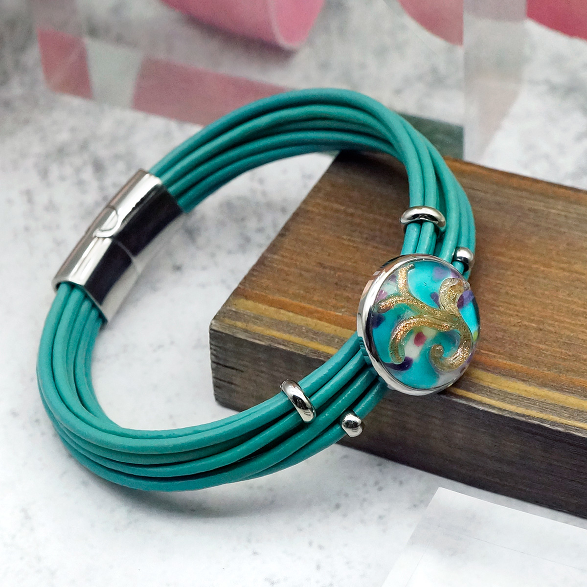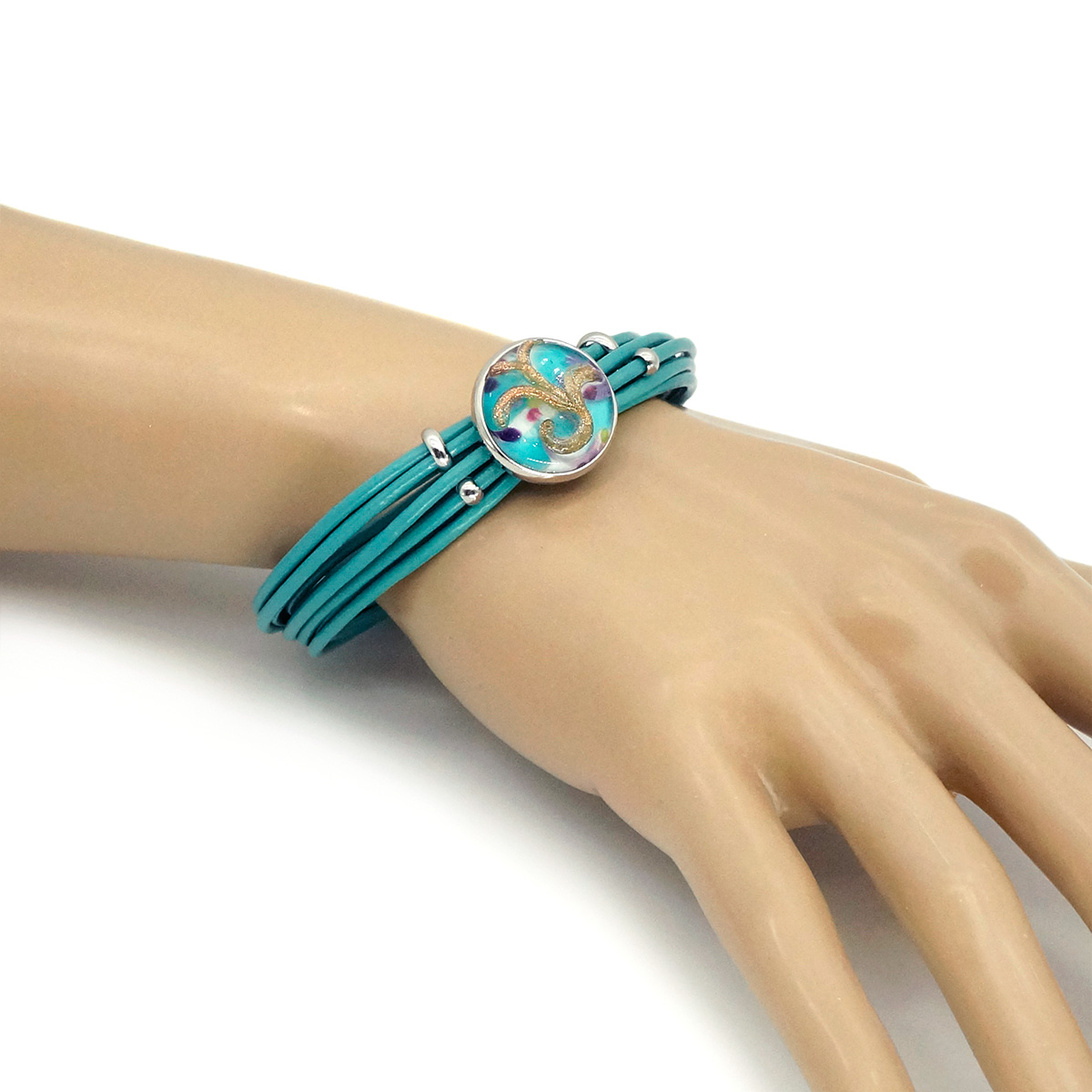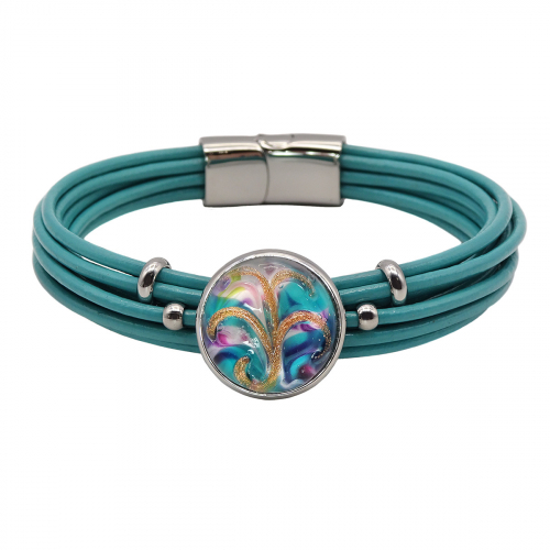 Браслет изготовлен из муранского стекла, натуральной кожи и гипоаллергенной ювелирной стали, что очень важно для людей с чувствительной кожей. Металл не темнеет и не подвергается воздействиям окружающей среды, надолго обеспечивая красивый внешний вид изделия.Крепкий магнитный замок с двойной защитой надежно фиксируется на запястье. Ширина браслета - 1,5 см. Диаметр стеклянного элемента - 2 см. Вес - 24 гр.