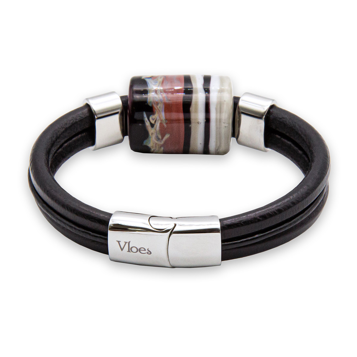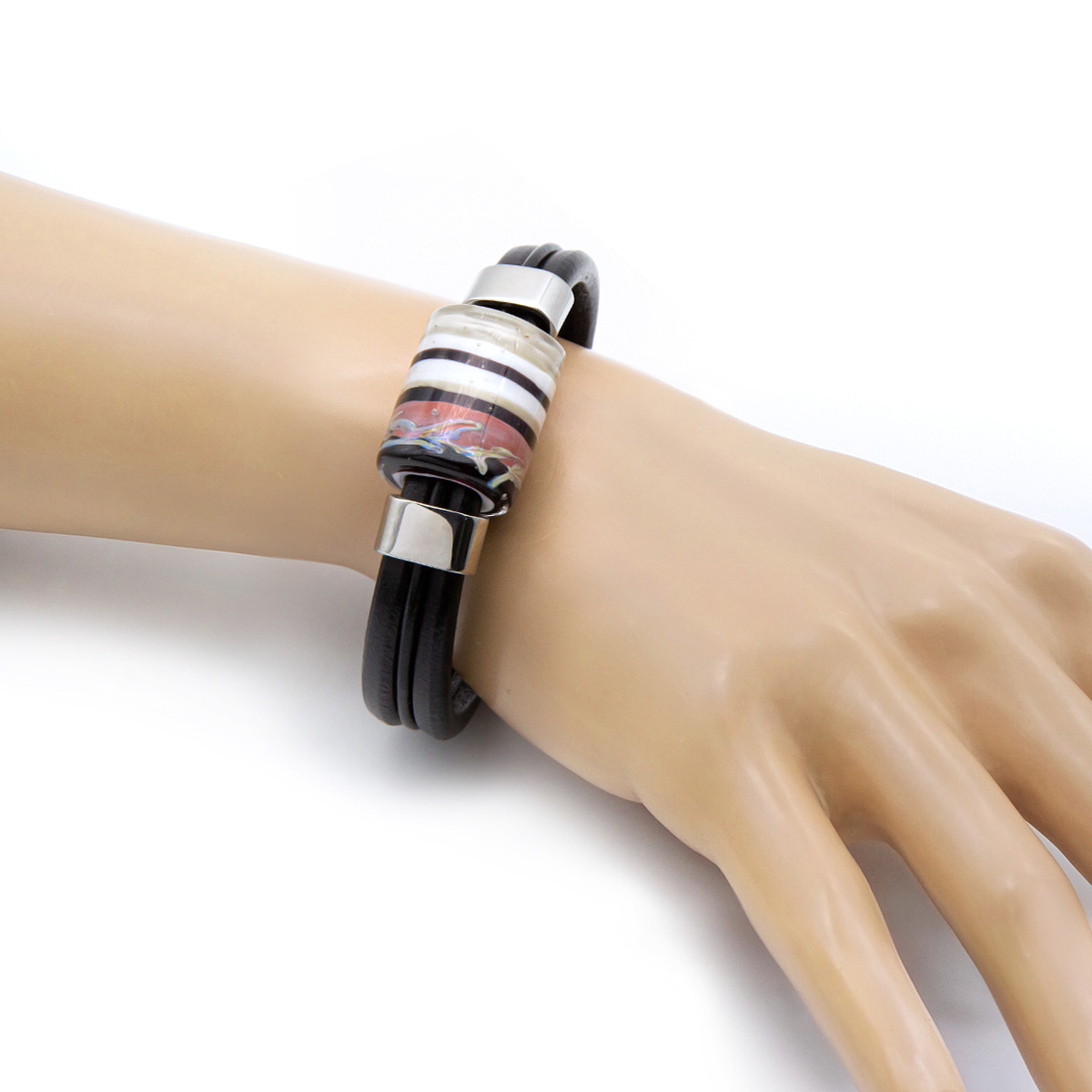 Браслет изготовлен из муранского стекла, натуральной кожи и гипоаллергенной ювелирной стали, что очень важно для людей с чувствительной кожей. Металл не темнеет и не подвергается воздействиям окружающей среды, надолго обеспечивая красивый внешний вид изделия. Крепкий магнитный замок с двойной защитой надежно фиксируется на запястье. Ширина браслета - 1,5 см. Размер стеклянной бусины - 1,9x2,5 см. Вес - 30 гр.