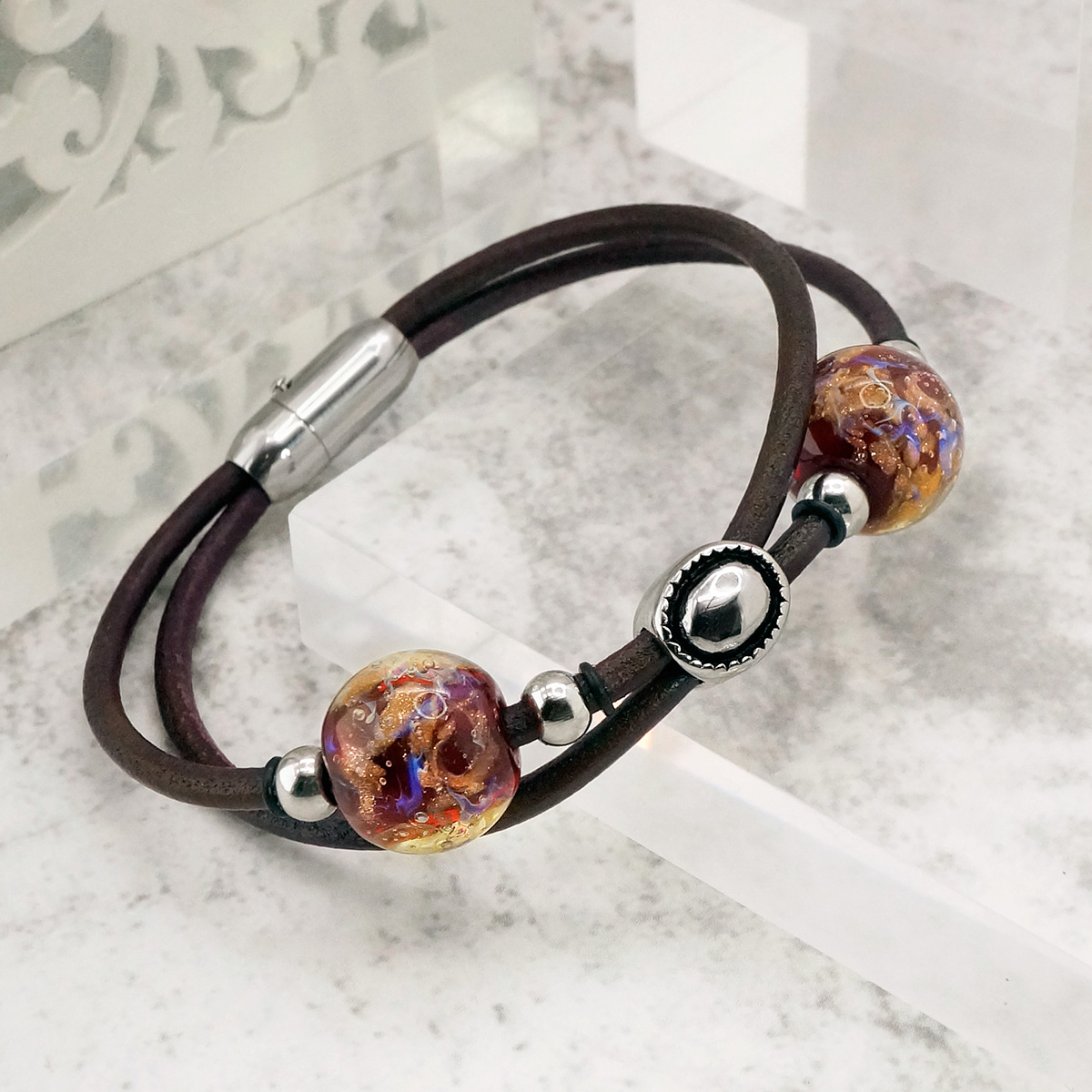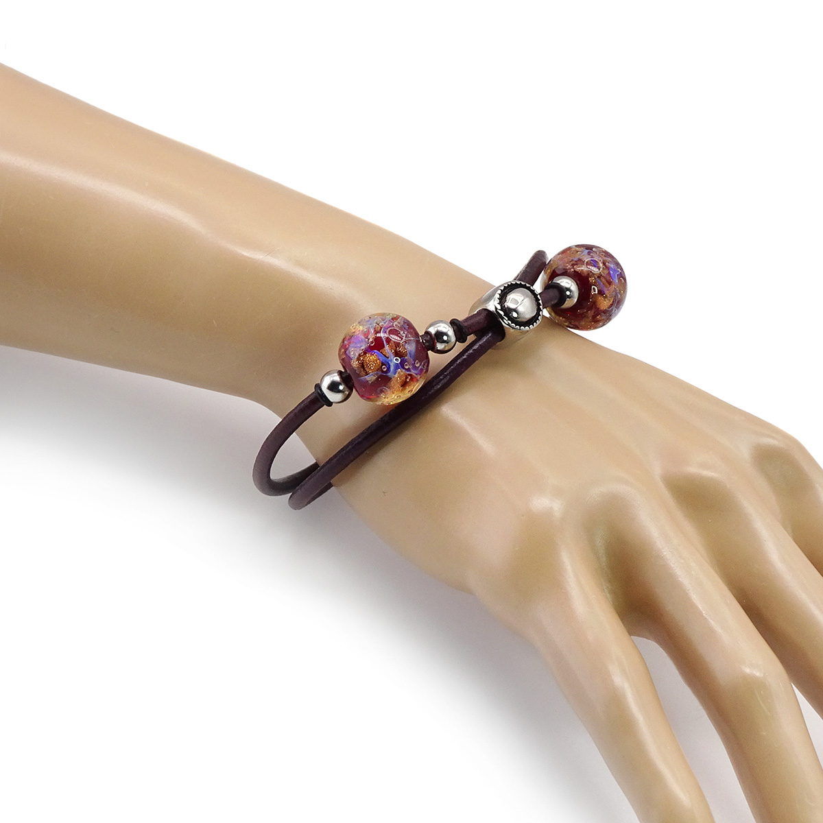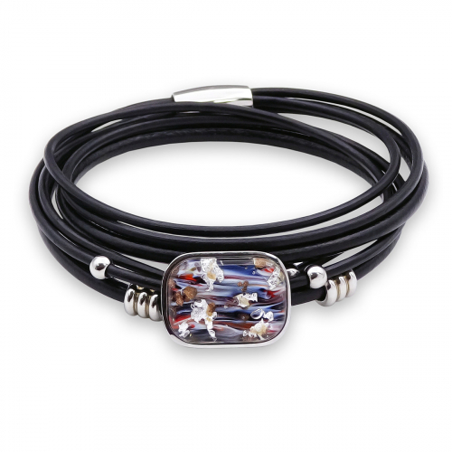 Браслет изготовлен из муранского стекла, натуральной кожи и гипоаллергенной ювелирной стали, что очень важно для людей с чувствительной кожей. Металл не темнеет и не подвергается воздействиям окружающей среды, надолго обеспечивая красивый внешний вид изделия. Крепкий магнитный замок надежно фиксируется на запястье. Ширина браслета - 0,5 см. Диаметр стеклянных шариков - 1,5 см. Вес -  гр.