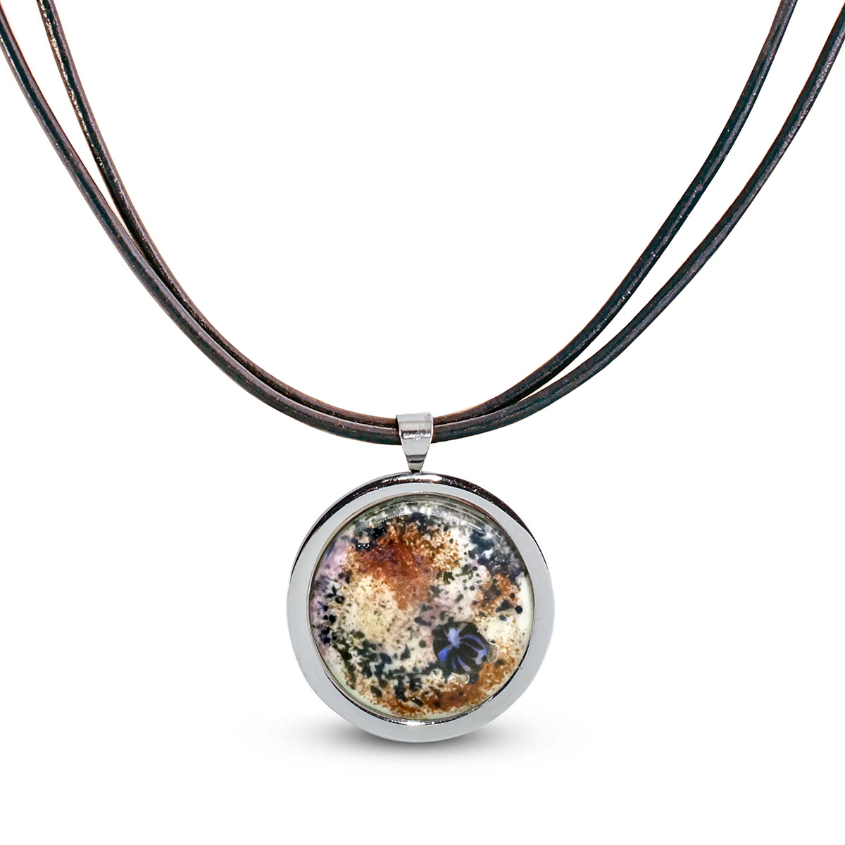 Колье изготовлено из натуральной кожи, муранского стекла и гипоаллергенной ювелирной стали, что очень важно для людей с чувствительной кожей. Металл не темнеет и не подвергается воздействиям окружающей среды, надолго обеспечивая красивый внешний вид изделия. Длина колье - 46 см + 5 см. удлиняющая цепочка. Диаметр стеклянного элемента - 2,5 см. Вес - 17 гр.