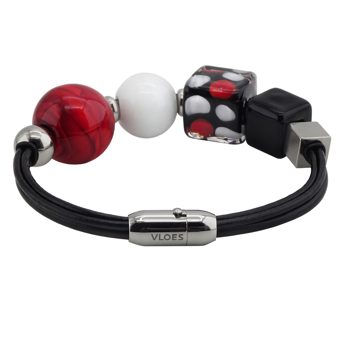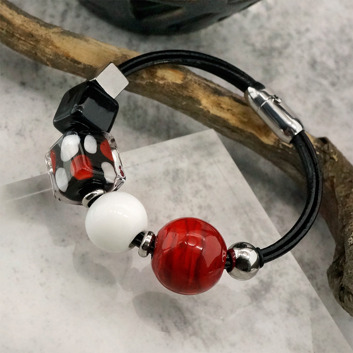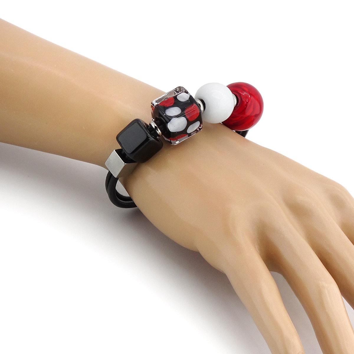 Браслет изготовлен из муранского стекла, натуральной кожи и гипоаллергенной ювелирной стали, что очень важно для людей с чувствительной кожей. Металл не темнеет и не подвергается воздействиям окружающей среды, надолго обеспечивая красивый внешний вид изделия. Крепкий магнитный замок надежно фиксируется на запястье. Ширина браслета - 0,5 см. Диаметр стеклянных шароов - 1,2 и 1,6 см. Размер куба - 1*1 и 1,4*1,2 см. Вес - 26 гр.