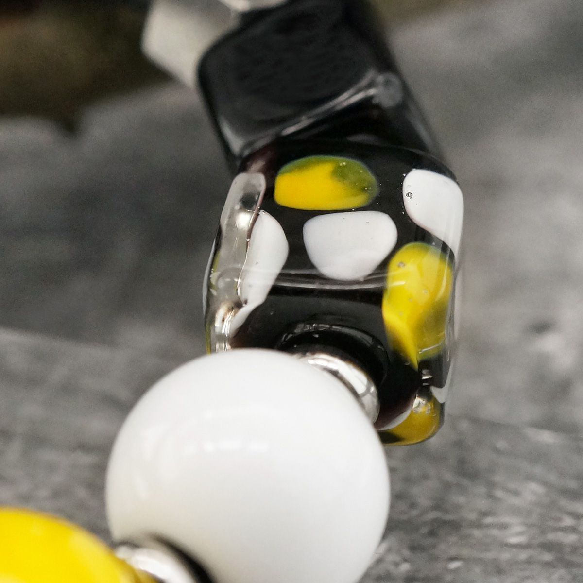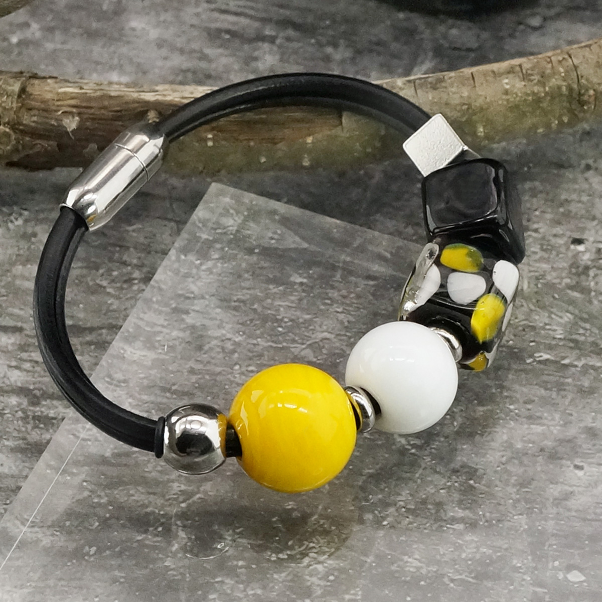 Браслет изготовлен из муранского стекла, натуральной кожи и гипоаллергенной ювелирной стали, что очень важно для людей с чувствительной кожей. Металл не темнеет и не подвергается воздействиям окружающей среды, надолго обеспечивая красивый внешний вид изделия. Крепкий магнитный замок надежно фиксируется на запястье. Ширина браслета - 0,5 см. Диаметр стеклянных шароов - 1,2 и 1,6 см. Размер куба - 1*1 и 1,4*1,2 см. Вес - 26 гр.