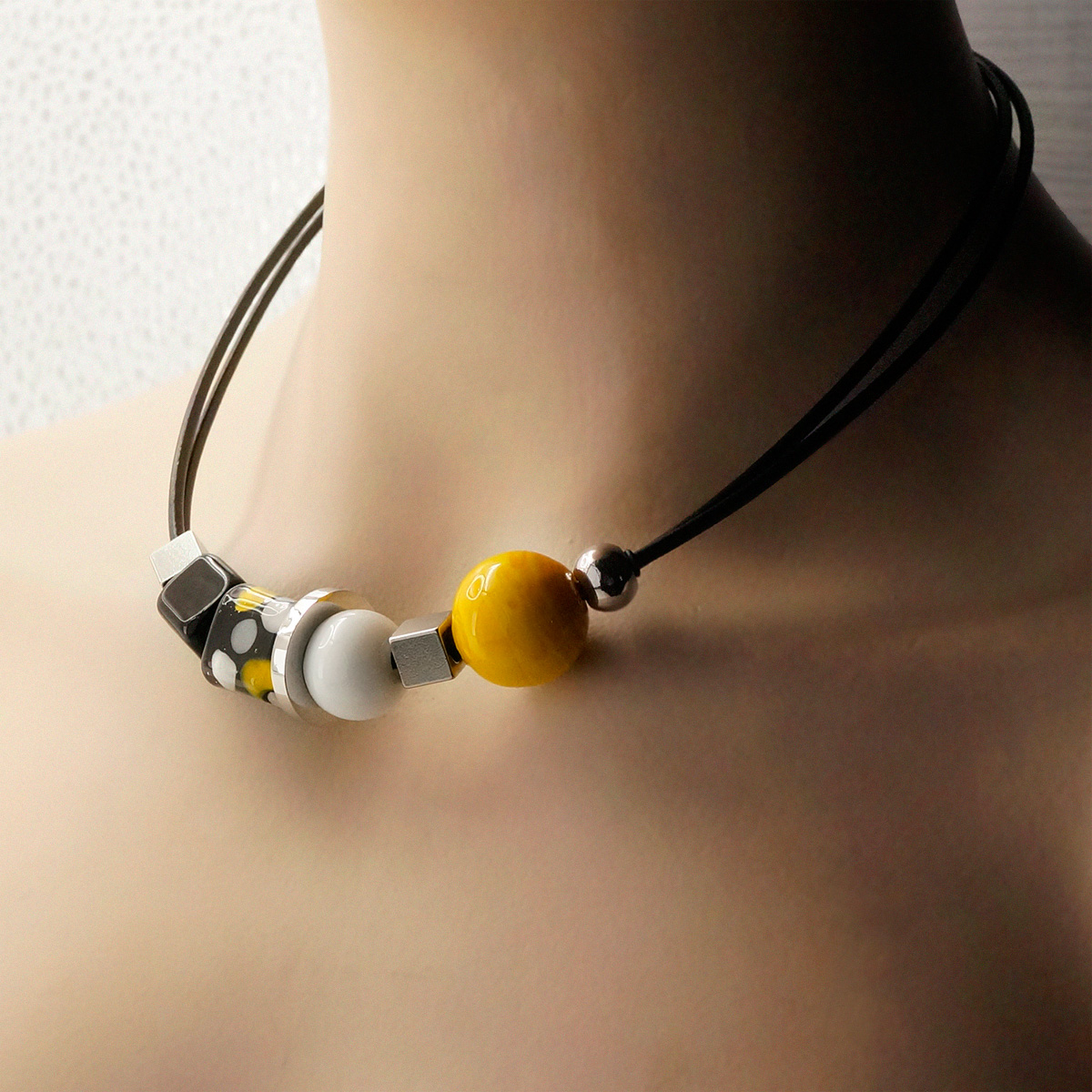 Колье изготовлено из натуральной кожи, муранского стекла и гипоаллергенной ювелирной стали, что очень важно для людей с чувствительной кожей. Металл не темнеет и не подвергается воздействиям окружающей среды, надолго обеспечивая красивый внешний вид изделия. Длина колье - 46 см + 5 см. удлиняющая цепочка. Диаметр стеклянных шароов - 1,6 и 1,2 см. Размер куба - 1x1 и 1,2х1,4 см. Вес - 32 гр.