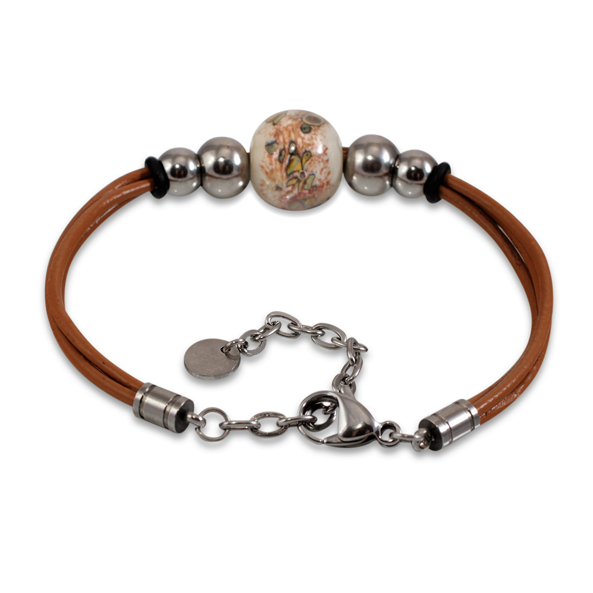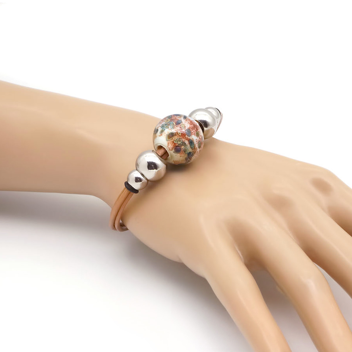 Браслет изготовлен из муранского стекла, натуральной кожи и гипоаллергенной ювелирной стали, что очень важно для людей с чувствительной кожей. Металл не темнеет и не подвергается воздействиям окружающей среды, надолго обеспечивая красивый внешний вид изделия. Застежка - карабин надежно фиксируется на запястье.  Ширина браслета - 0,5 см. Диаметр стеклянного шара 1,8 см. Вес - 27 гр.