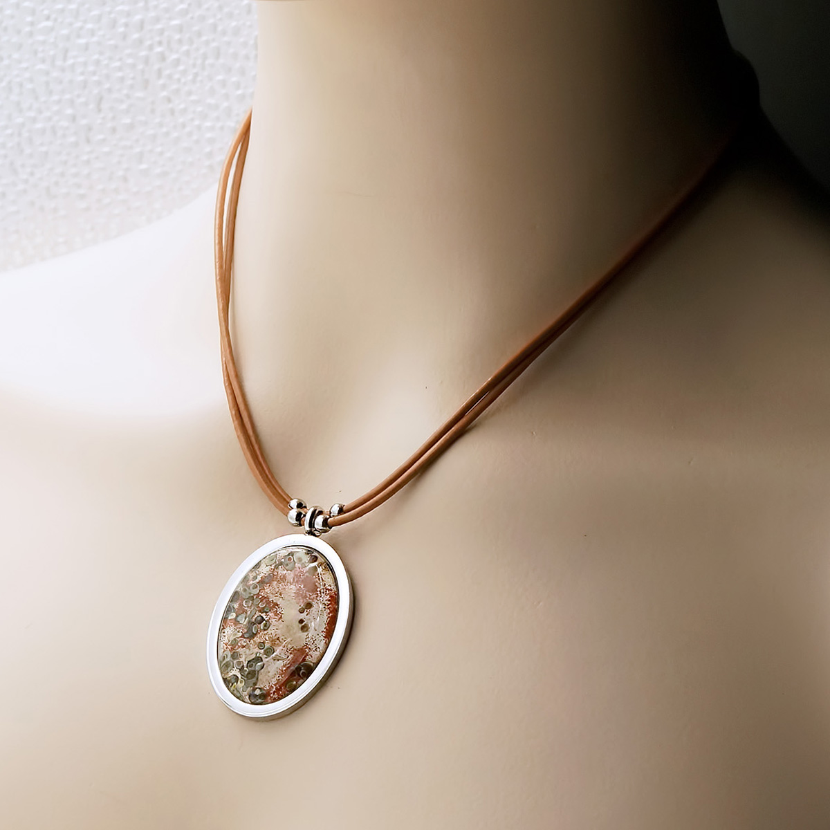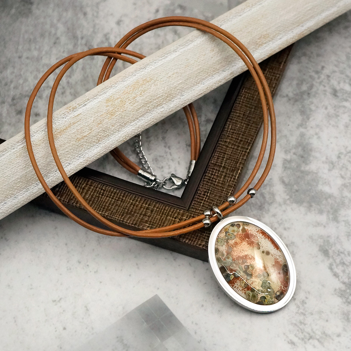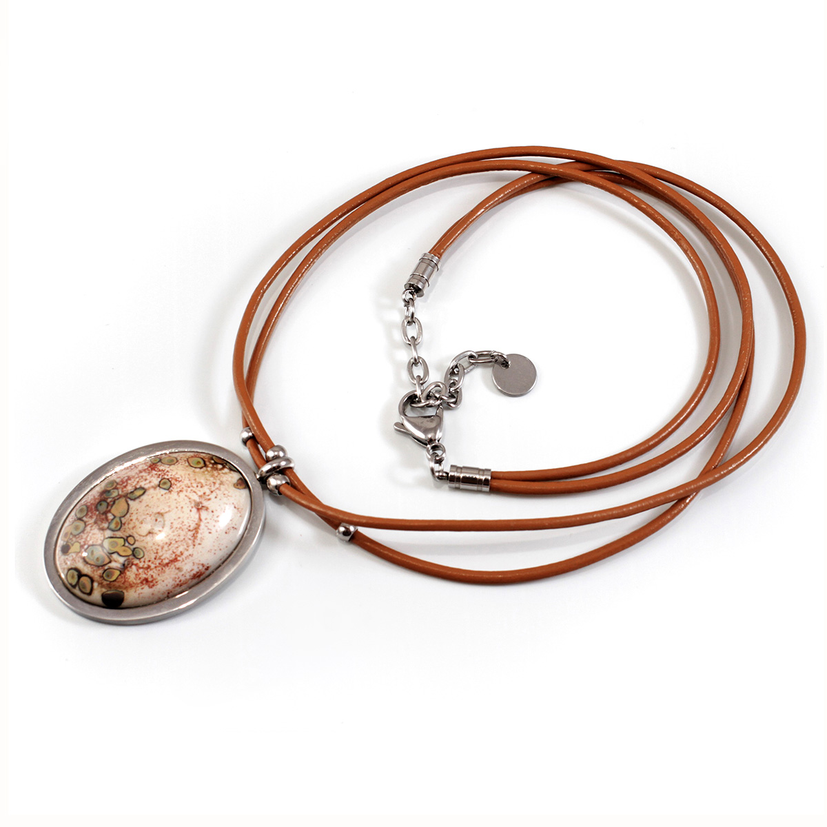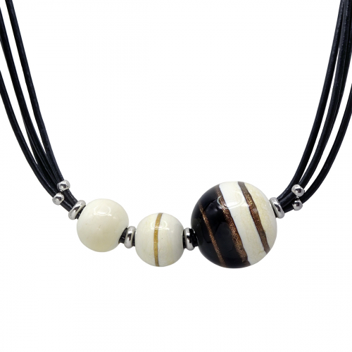 Колье изготовлено из натуральной кожи, муранского стекла и гипоаллергенной ювелирной стали, что очень важно для людей с чувствительной кожей. Металл не темнеет и не подвергается воздействиям окружающей среды, надолго обеспечивая красивый внешний вид изделия. Длина колье - 46 см + 5 см. удлиняющая цепочка. Размер стеклянного элемента - 4х3 см.  Вес - 20 гр.
