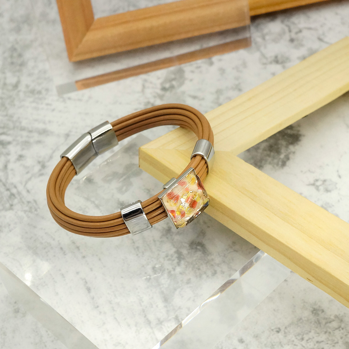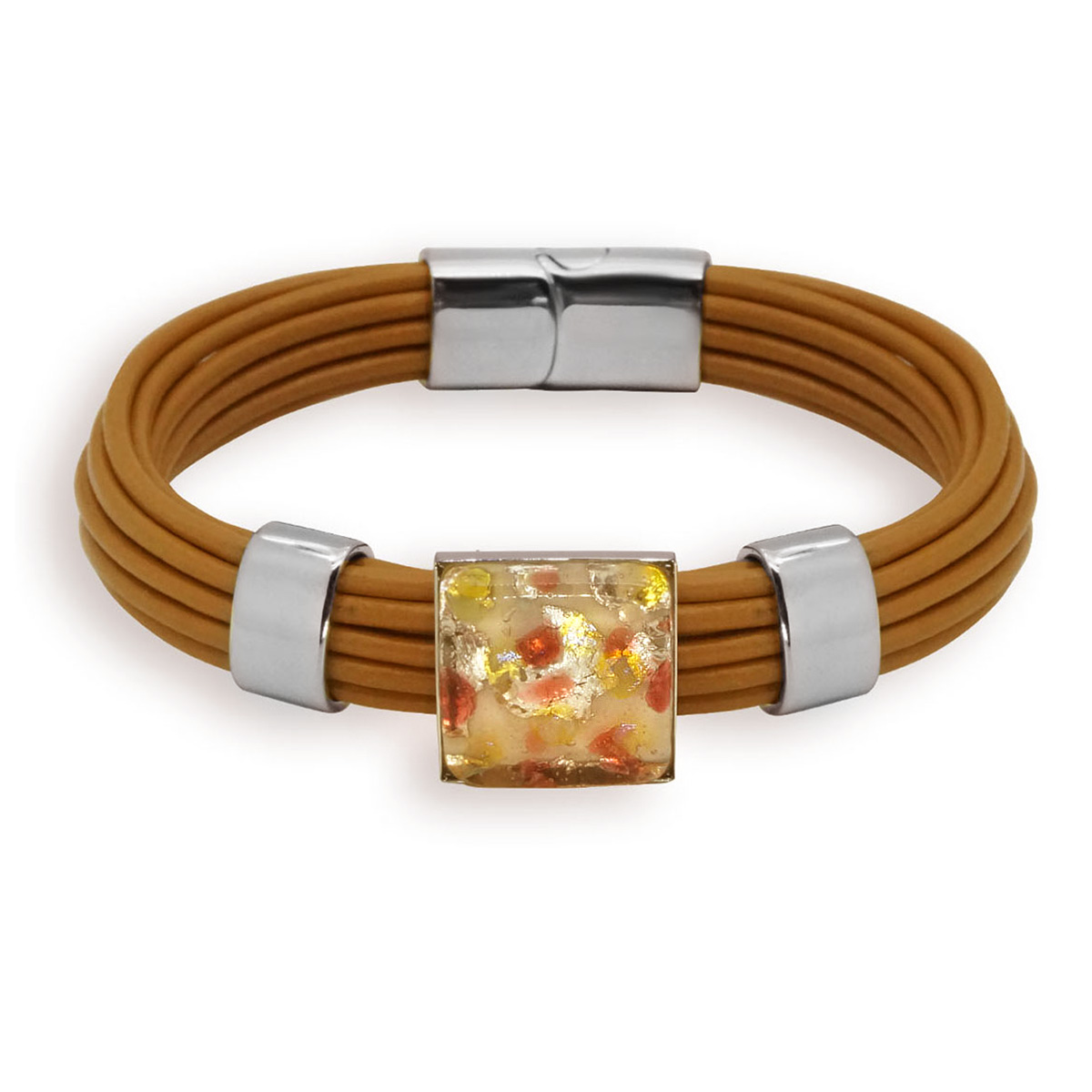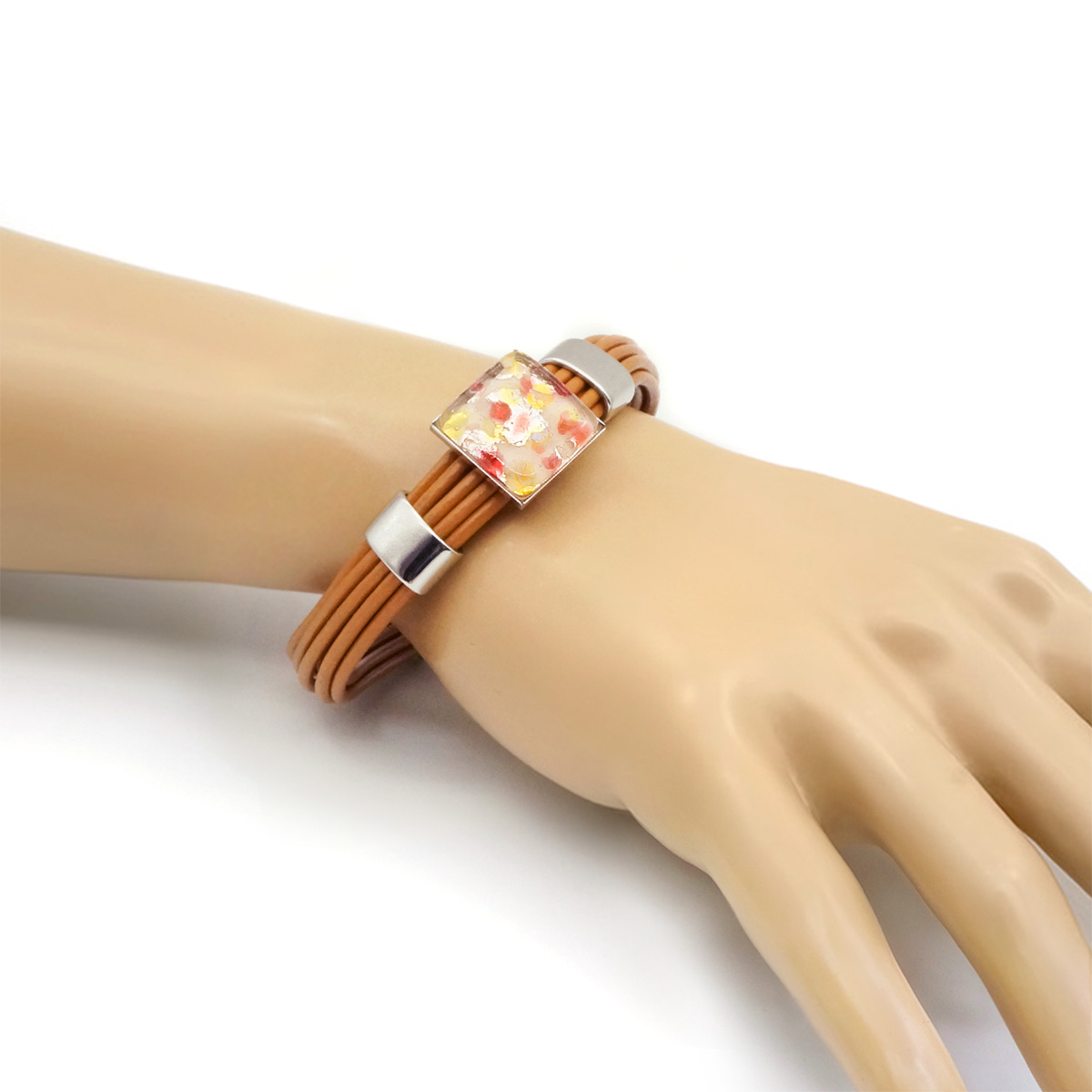 Браслет изготовлен из муранского стекла, натуральной кожи и гипоаллергенной ювелирной стали, что очень важно для людей с чувствительной кожей. Металл не темнеет и не подвергается воздействиям окружающей среды, надолго обеспечивая красивый внешний вид изделия. Крепкий магнитный замок с двойной защитой надежно фиксируется на запястье. Ширина браслета - 1,5 см. Размер стеклянного элемента - 1,6*1,6 см. Вес - 24 гр.