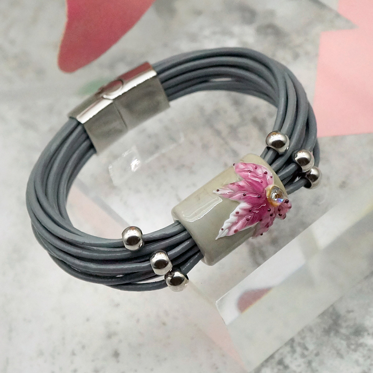 Браслет изготовлен из муранского стекла, натуральной кожи и гипоаллергенной ювелирной стали, что очень важно для людей с чувствительной кожей. Металл не темнеет и не подвергается воздействиям окружающей среды, надолго обеспечивая красивый внешний вид изделия. Крепкий магнитный замок с двойной защитой надежно фиксируется на запястье. Ширина браслета - 1,5 см. Размер стеклянной бусины - 1,9x2,5 см. Вес - 33 гр.