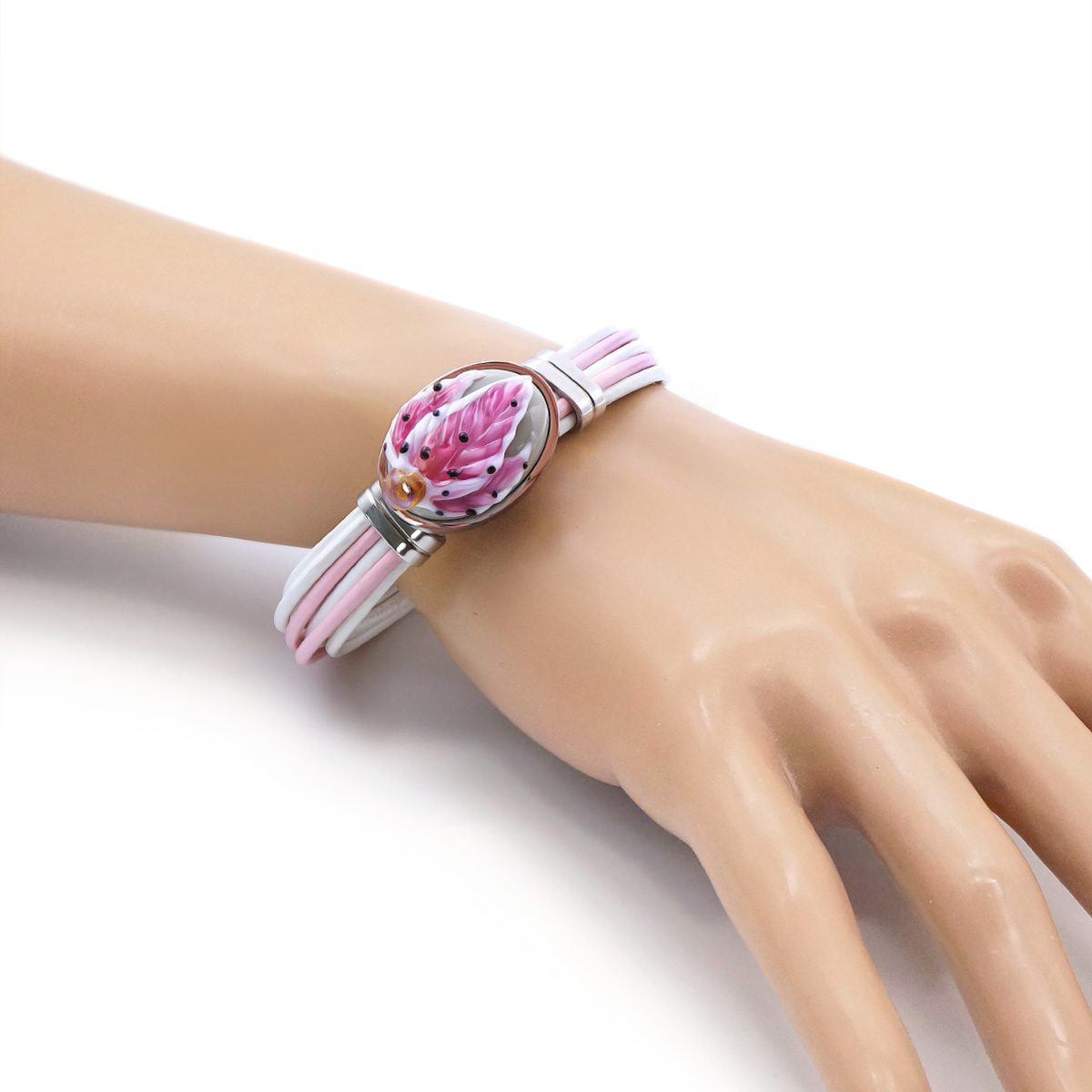 Браслет изготовлен из муранского стекла, натуральной кожи и гипоаллергенной ювелирной стали, что очень важно для людей с чувствительной кожей. Металл не темнеет и не подвергается воздействиям окружающей среды, надолго обеспечивая красивый внешний вид изделия. Крепкий магнитный замок с двойной защитой надежно фиксируется на запястье. Ширина браслета - 1,5 см. Размер стеклянного элемента - 1,9x2,6 см. Вес - 23 гр.