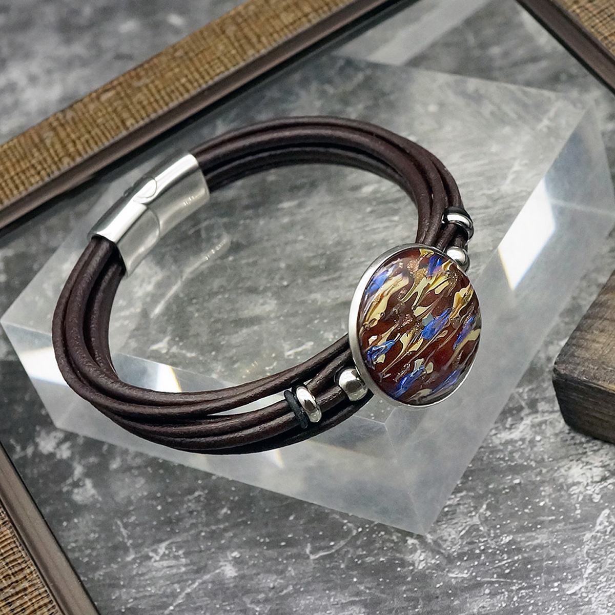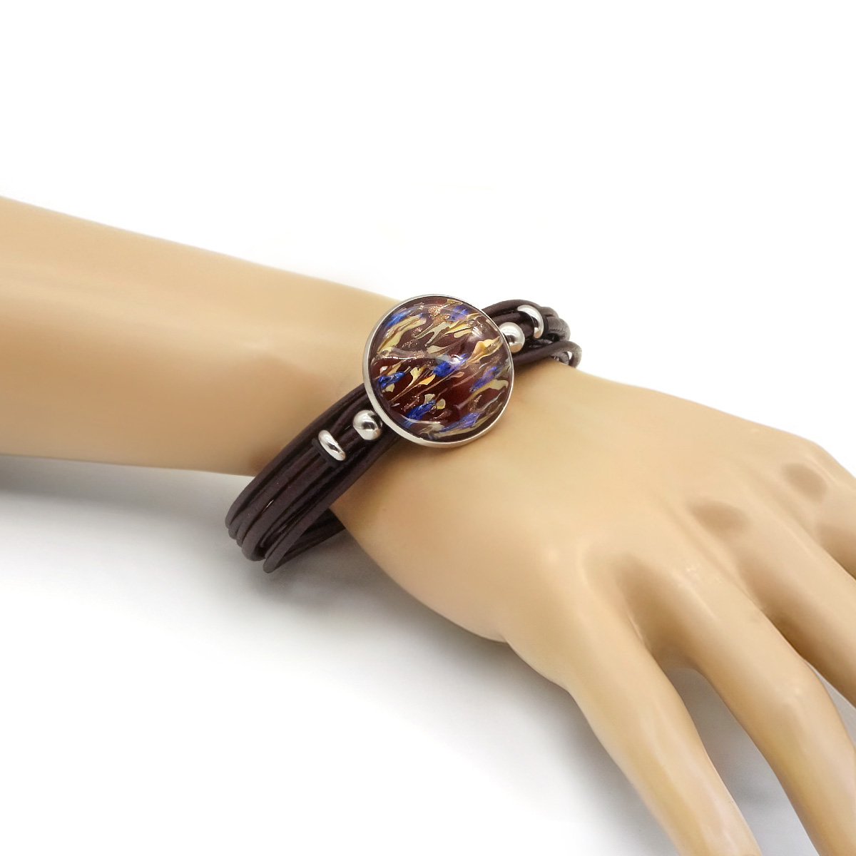 Браслет изготовлен из муранского стекла, натуральной кожи и гипоаллергенной ювелирной стали, что очень важно для людей с чувствительной кожей. Металл не темнеет и не подвергается воздействиям окружающей среды, надолго обеспечивая красивый внешний вид изделия. Крепкий магнитный замок с двойной защитой надежно фиксируется на запястье. Ширина браслета - 1,5 см. Диаметр стеклянного элемента - 2 см. Вес - 22 гр.