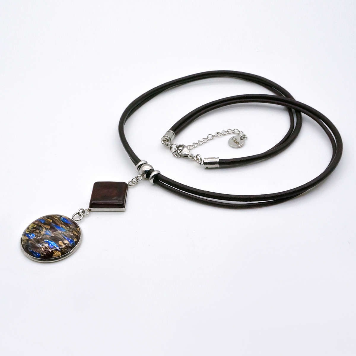 Колье изготовлено из натуральной кожи, муранского стекла и гипоаллергенной ювелирной стали, что очень важно для людей с чувствительной кожей. Металл не темнеет и не подвергается воздействиям окружающей среды, надолго обеспечивая красивый внешний вид изделия. Длина колье - 46 см + 5 см. удлиняющая цепочка. Размер стеклянных элементов - 2,6х2 и 1,6 см.Вес - 26 гр.