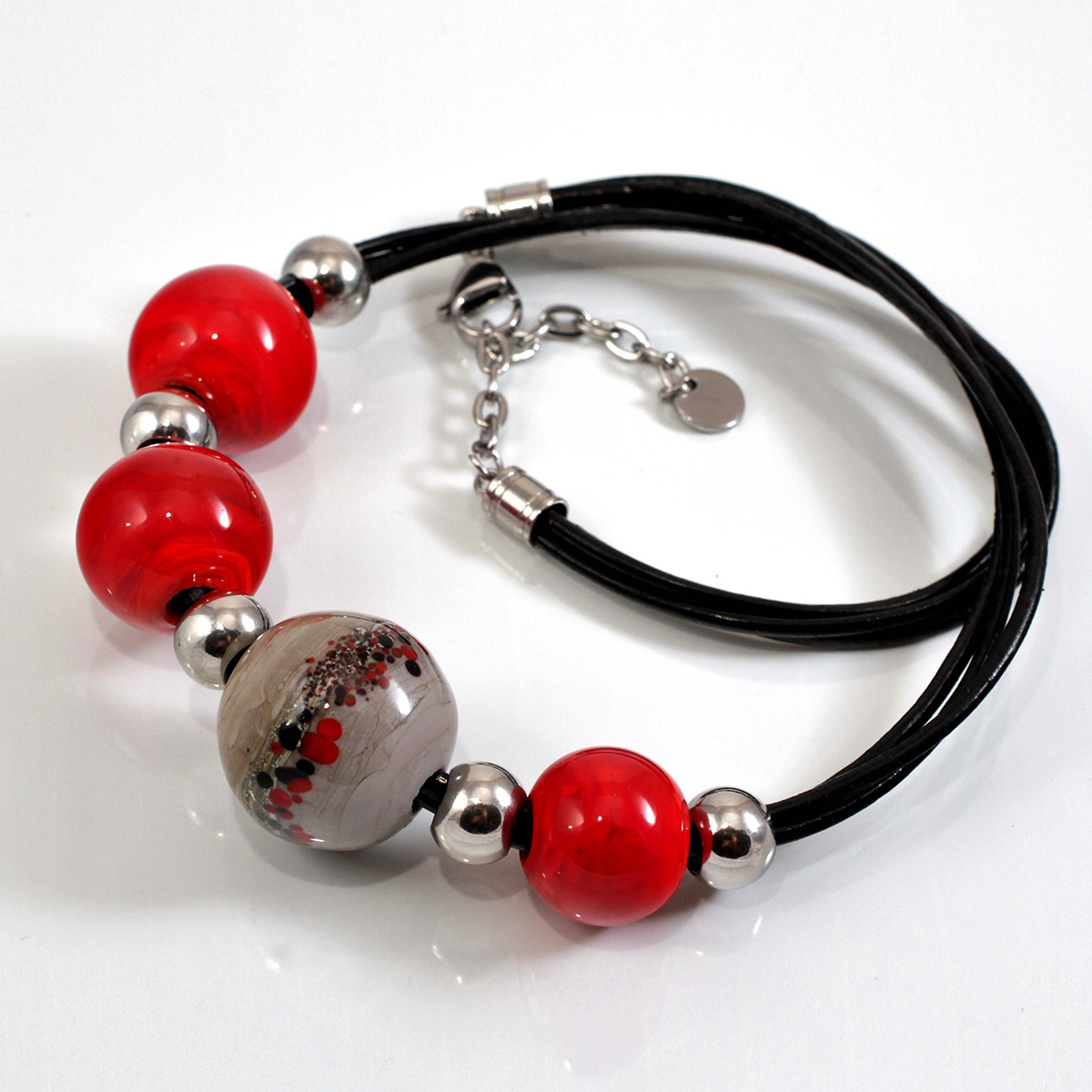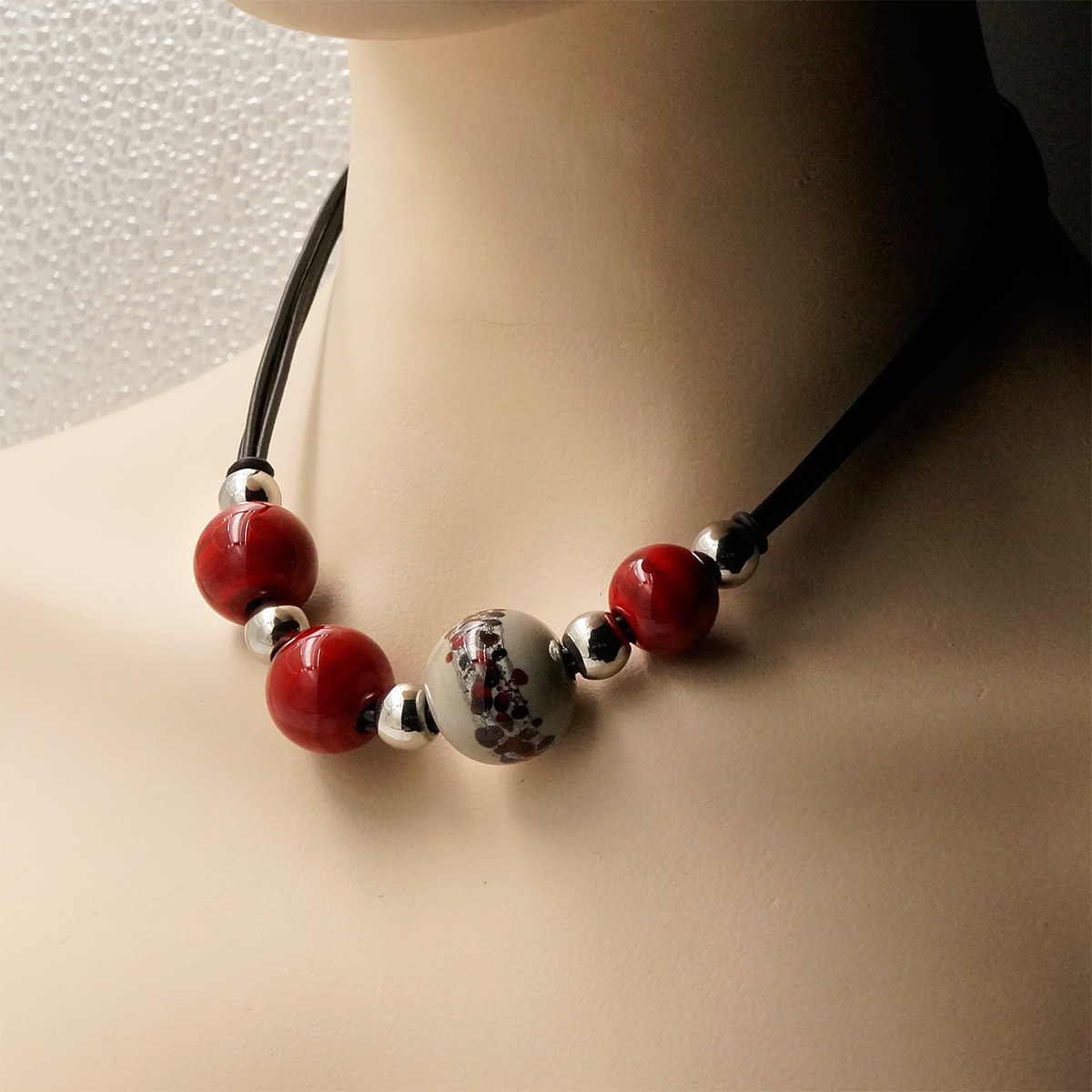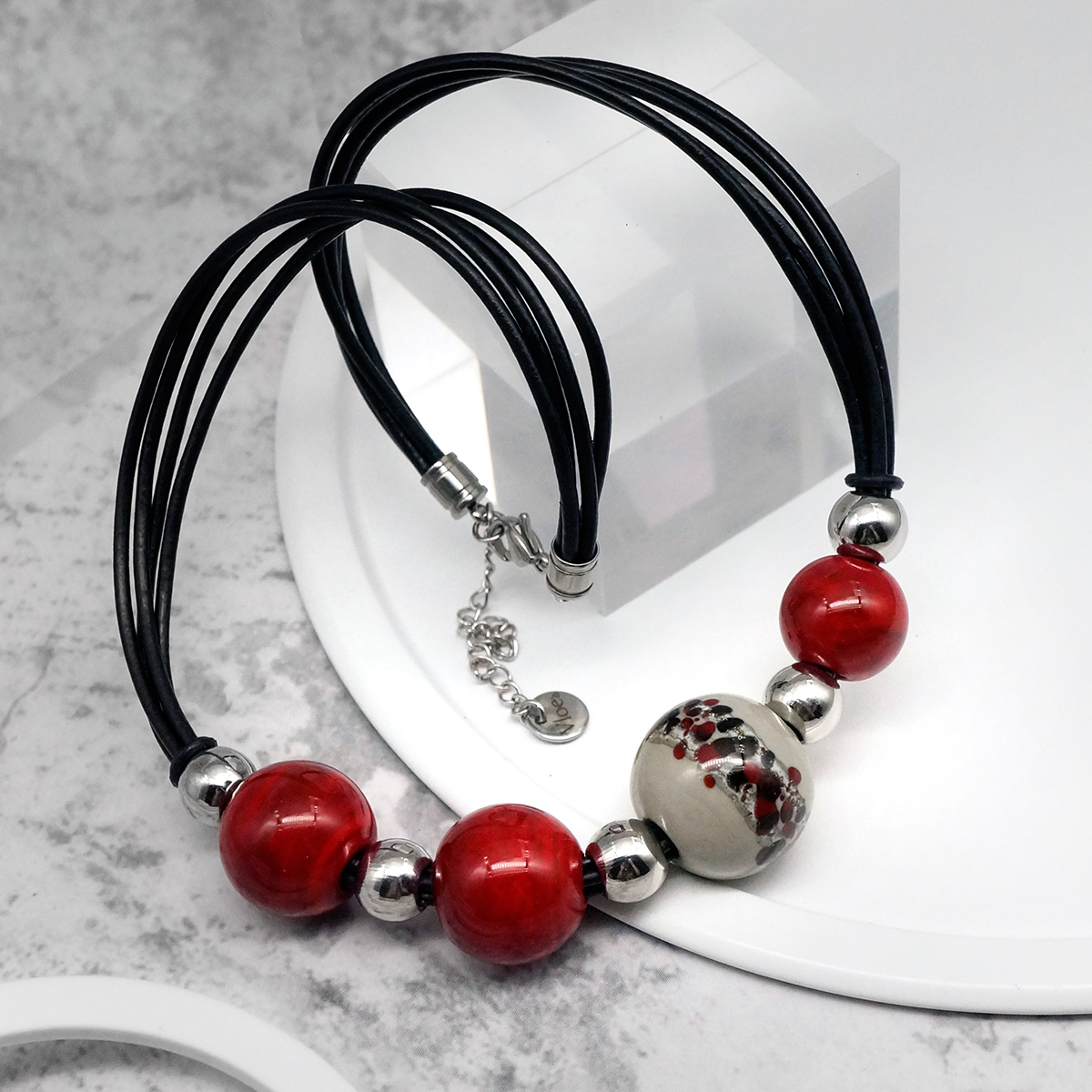 Колье изготовлено из натуральной кожи, муранского стекла и гипоаллергенной ювелирной стали, что очень важно для людей с чувствительной кожей. Металл не темнеет и не подвергается воздействиям окружающей среды, надолго обеспечивая красивый внешний вид изделия. Длина колье - 46 см + 5 см. удлиняющая цепочка. Диаметр стеклянных шаров - 1,5, 1,8 и 2,2 см. Вес - 55 гр.