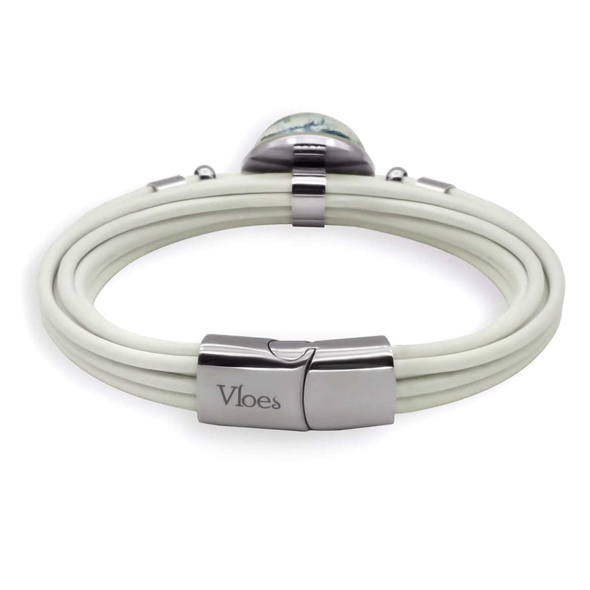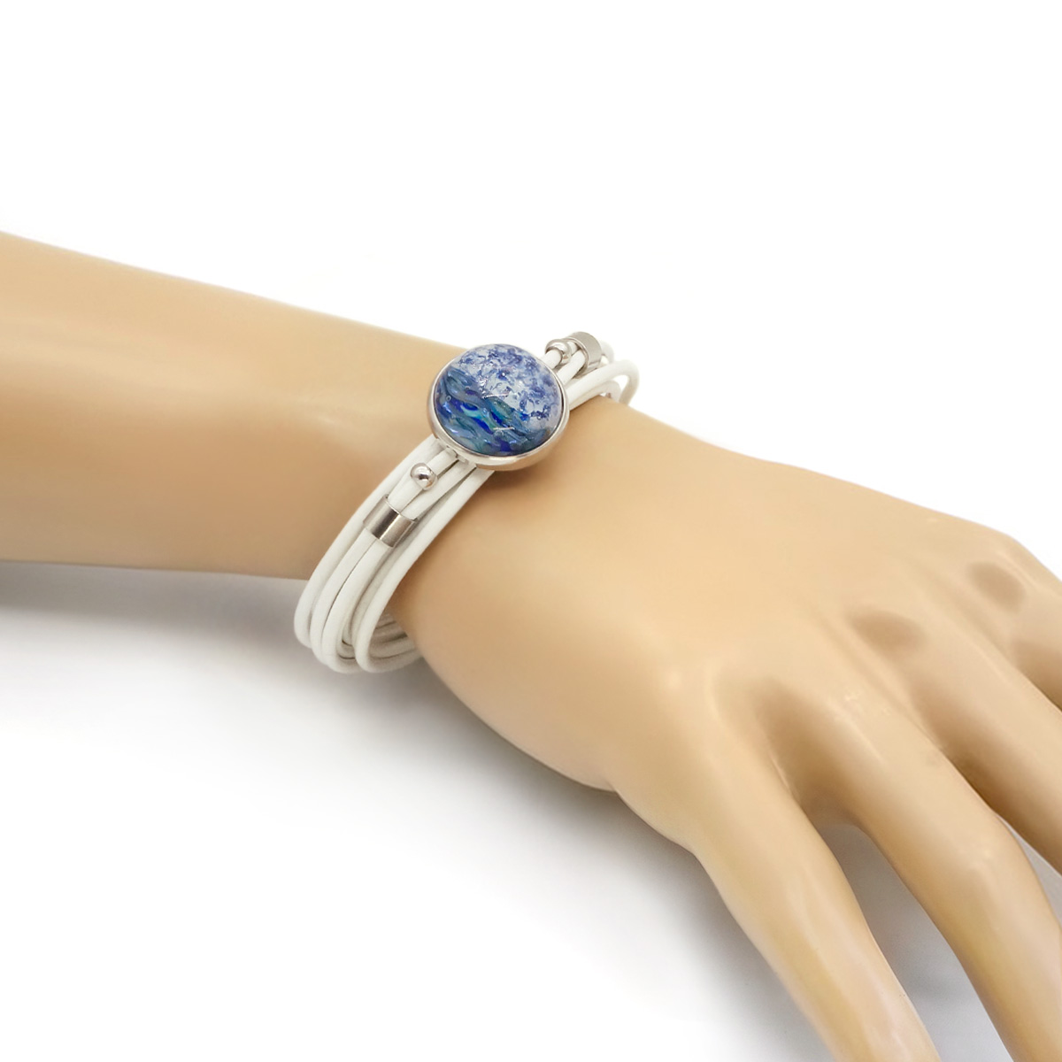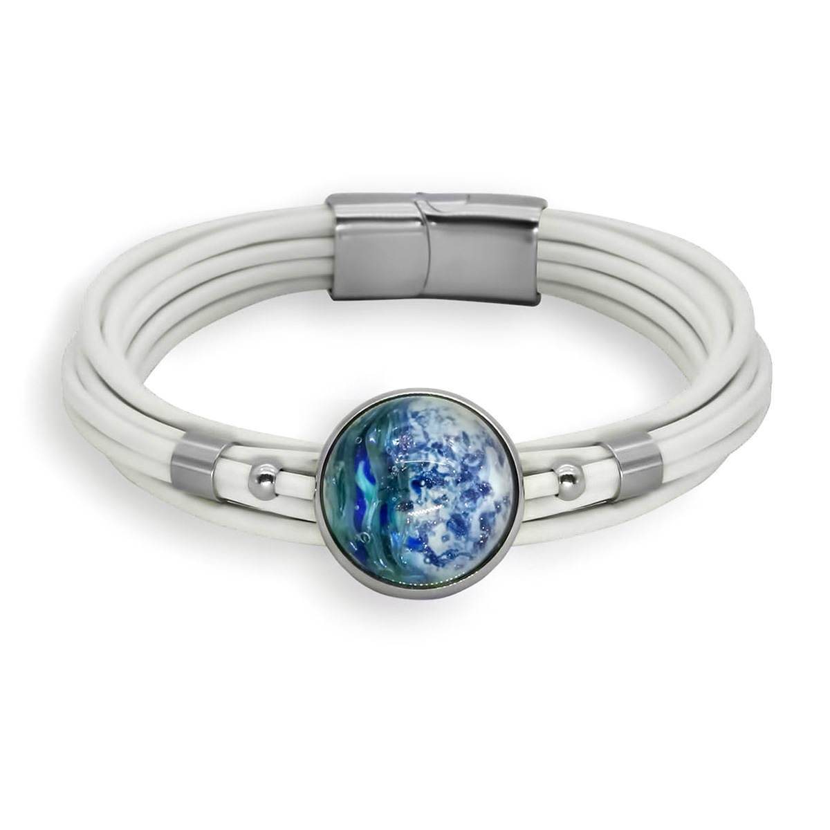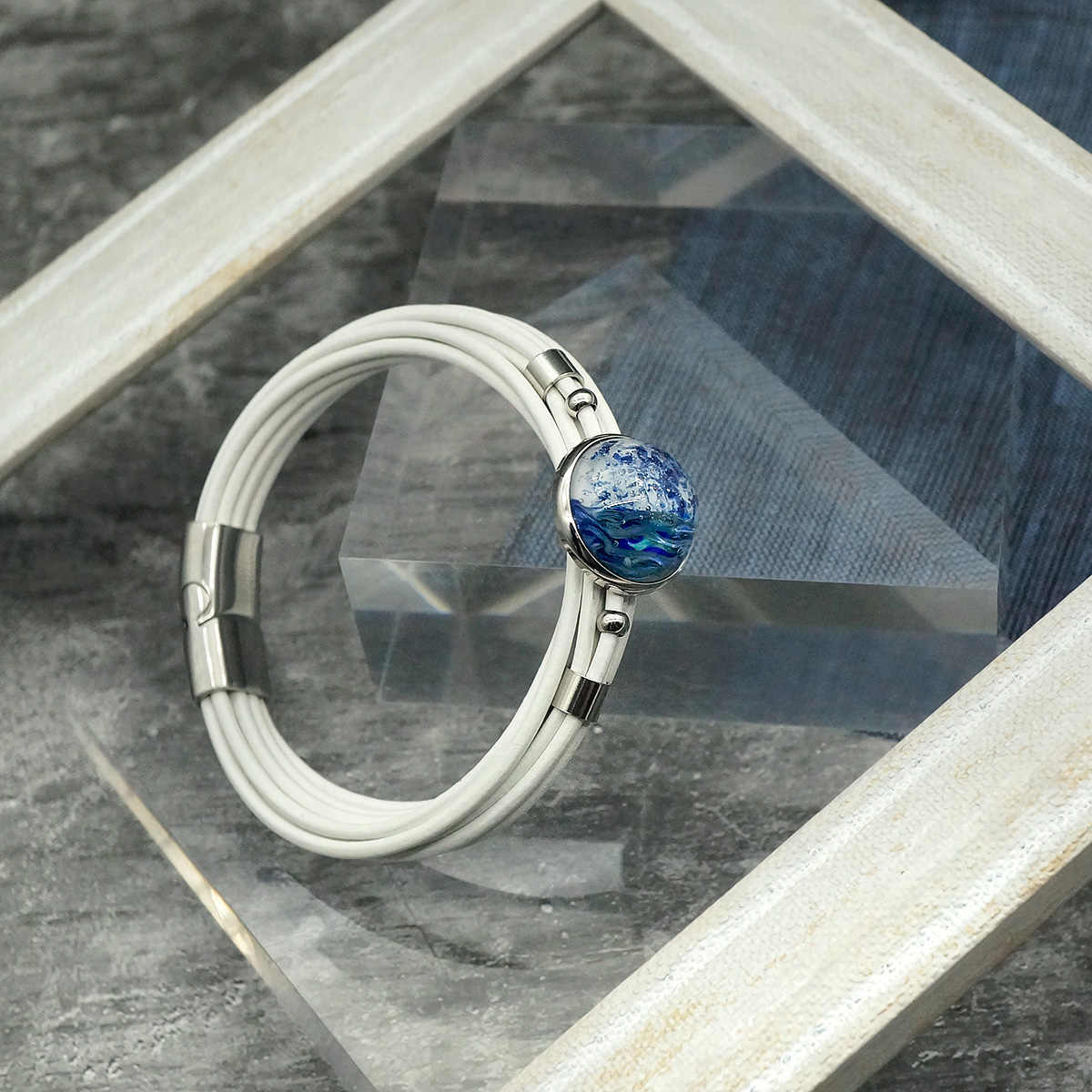 Браслет изготовлен из муранского стекла, натуральной кожи и гипоаллергенной ювелирной стали, что очень важно для людей с чувствительной кожей. Металл не темнеет и не подвергается воздействиям окружающей среды, надолго обеспечивая красивый внешний вид изделия. Крепкий магнитный замок с двойной защитой надежно фиксируется на запястье. Ширина браслета - 1,5 см. Диаметр стеклянного элемента - 2 см. Вес - 24 гр.