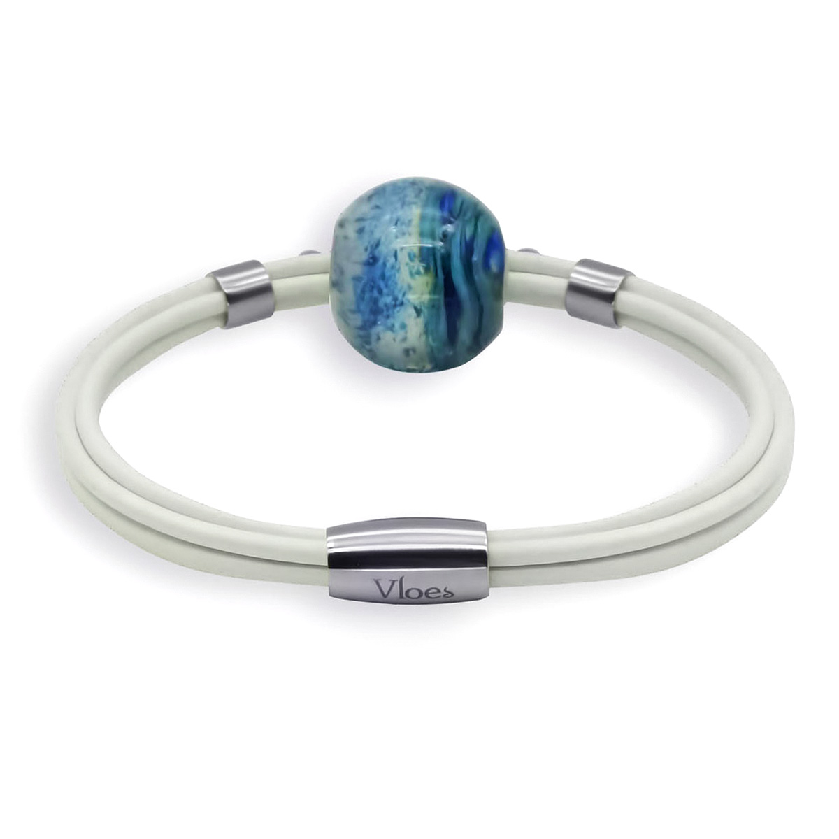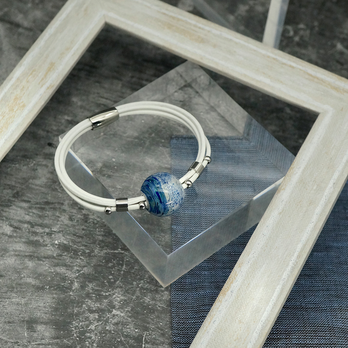 Браслет изготовлен из муранского стекла, натуральной кожи и гипоаллергенной ювелирной стали, что очень важно для людей с чувствительной кожей. Металл не темнеет и не подвергается воздействиям окружающей среды, надолго обеспечивая красивый внешний вид изделия. Крепкий магнитный замок надежно фиксируется на запястье. Ширина браслета - 0,5 см.  Диаметр стеклянного шара 1,8 см.  Вес - 16 гр.