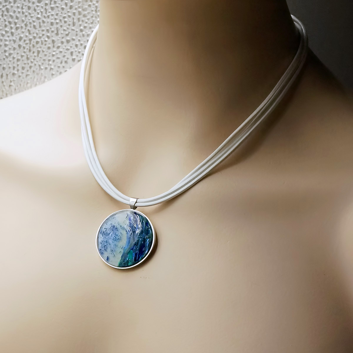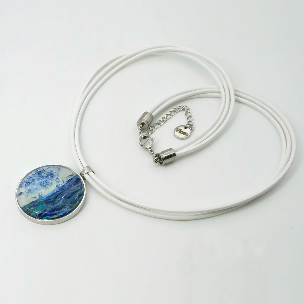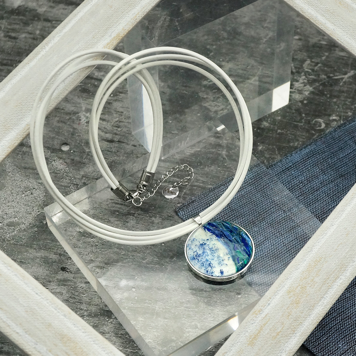 Колье изготовлено из натуральной кожи, муранского стекла и гипоаллергенной ювелирной стали, что очень важно для людей с чувствительной кожей. Металл не темнеет и не подвергается воздействиям окружающей среды, надолго обеспечивая красивый внешний вид изделия. Длина колье - 46 см + 5 см. удлиняющая цепочка. Диаметр стеклянного элемента - 3 см. Вес - 23 гр.