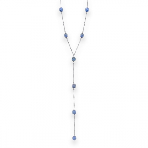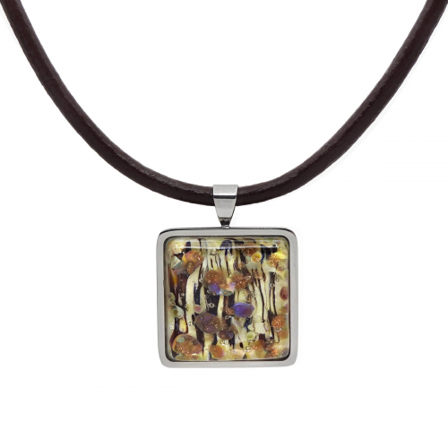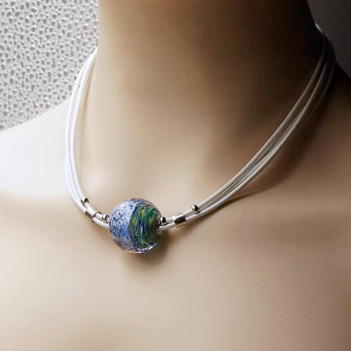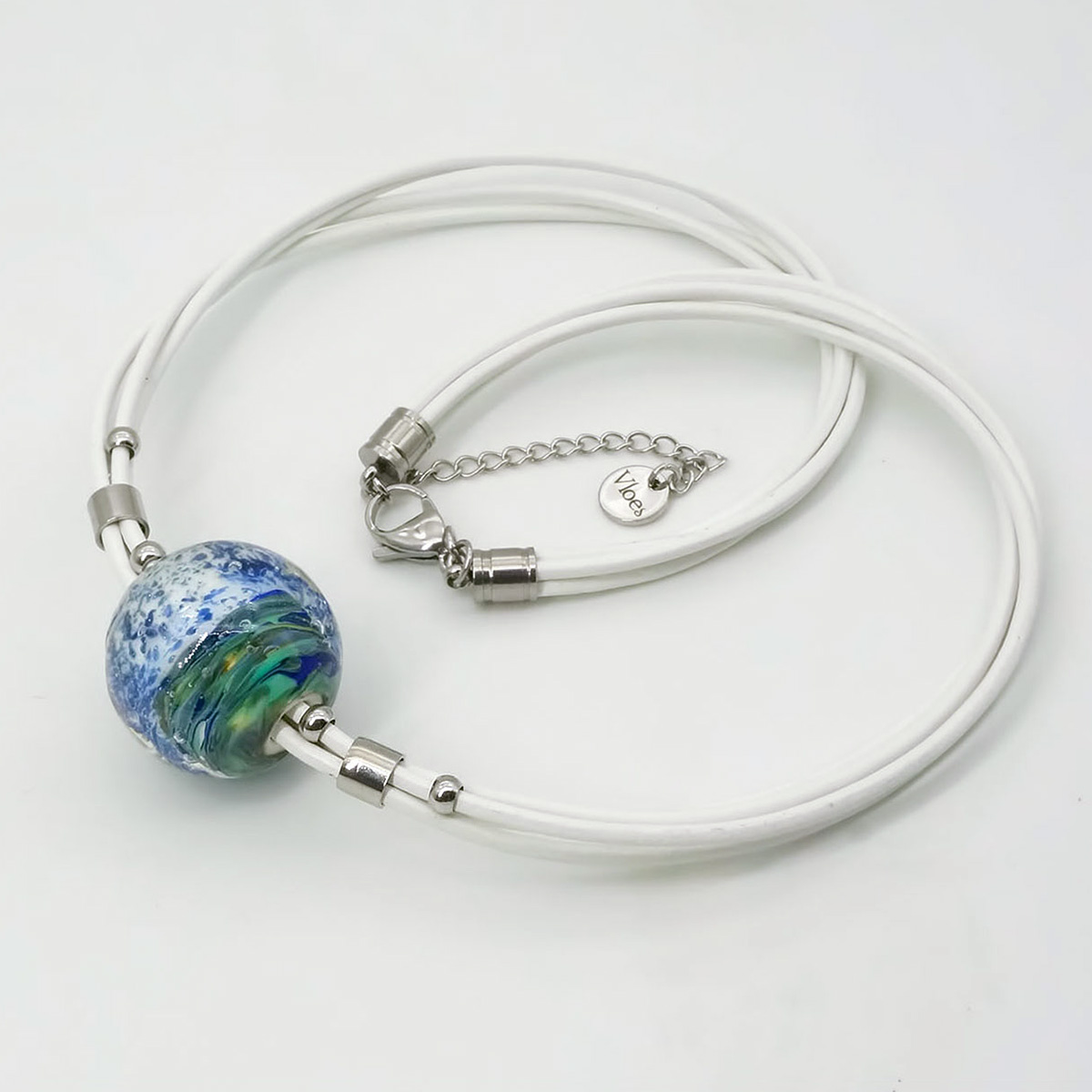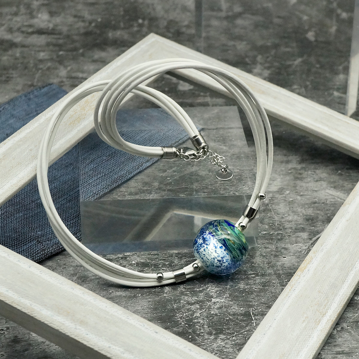 Колье изготовлено из натуральной кожи, муранского стекла и гипоаллергенной ювелирной стали, что очень важно для людей с чувствительной кожей. Металл не темнеет и не подвергается воздействиям окружающей среды, надолго обеспечивая красивый внешний вид изделия. Длина колье - 46 см + 5 см. удлиняющая цепочка. Диаметр стеклянного шара - 2,5 см. Вес - 30 гр.