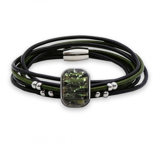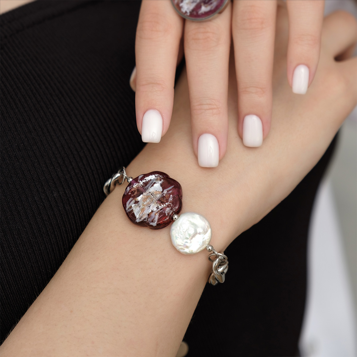 Браслет изготовлен из муранского стекла и и гипоаллергенной ювелирной стали, что очень важно для людей с чувствительной кожей. Металл не темнеет и не подвергается воздействиям окружающей среды, надолго обеспечивая красивый внешний вид изделия. Длина браслета - 16,5 см + 5 см удлиняющая цепочка. Размеры стеклянных бусин - 2 и 1,8 см. Вес - 24 гр.