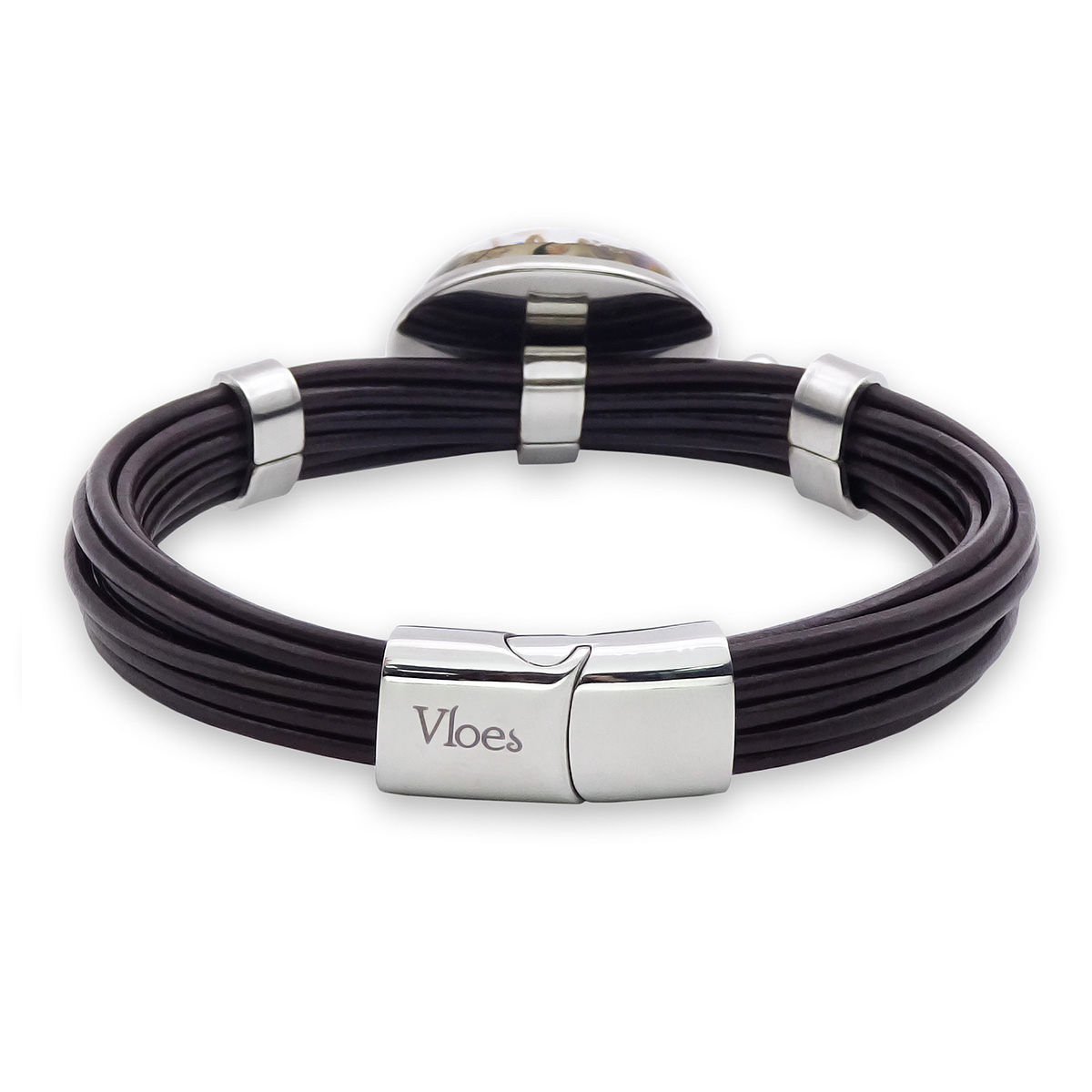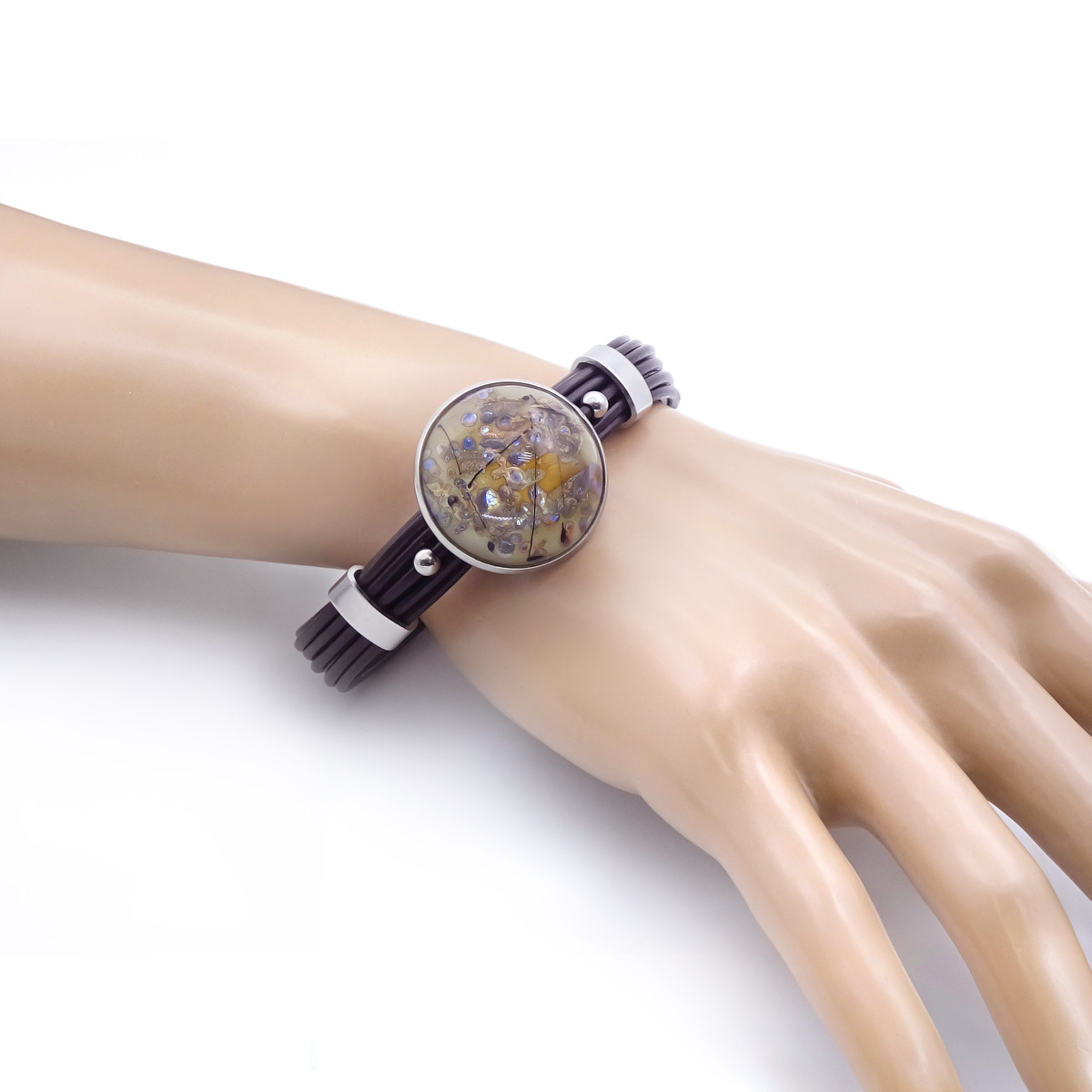Браслет изготовлен из муранского стекла, натуральной кожи и гипоаллергенной ювелирной стали, что очень важно для людей с чувствительной кожей. Металл не темнеет и не подвергается воздействиям окружающей среды, надолго обеспечивая красивый внешний вид изделия. Крепкий магнитный замок с двойной защитой надежно фиксируется на запястье. Ширина браслета - 1,5 см. Диаметр стеклянного элемента - 2,5 см. Вес - 26 гр.