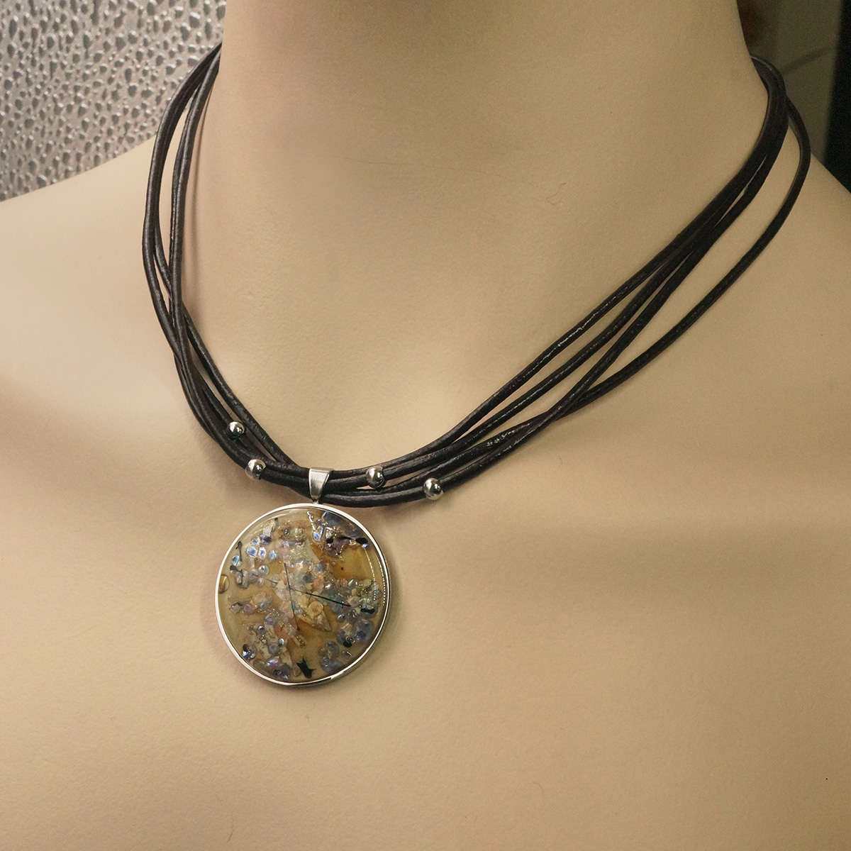 Колье изготовлено из натуральной кожи, муранского стекла и гипоаллергенной ювелирной стали, что очень важно для людей с чувствительной кожей. Металл не темнеет и не подвергается воздействиям окружающей среды, надолго обеспечивая красивый внешний вид изделия. Длина колье - 46 см + 5 см. удлиняющая цепочка. Диаметр стеклянного элемента - 3 см. Вес - 25 гр.